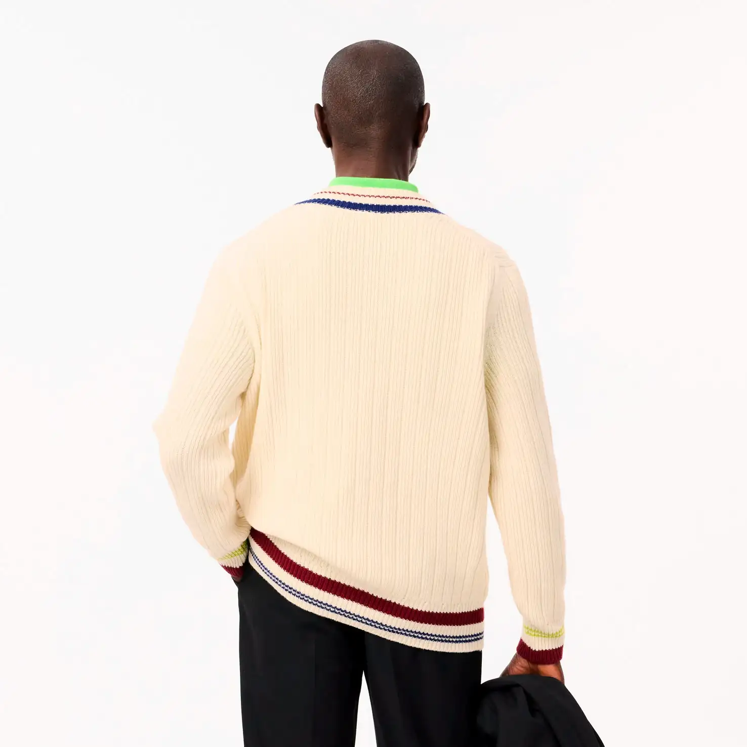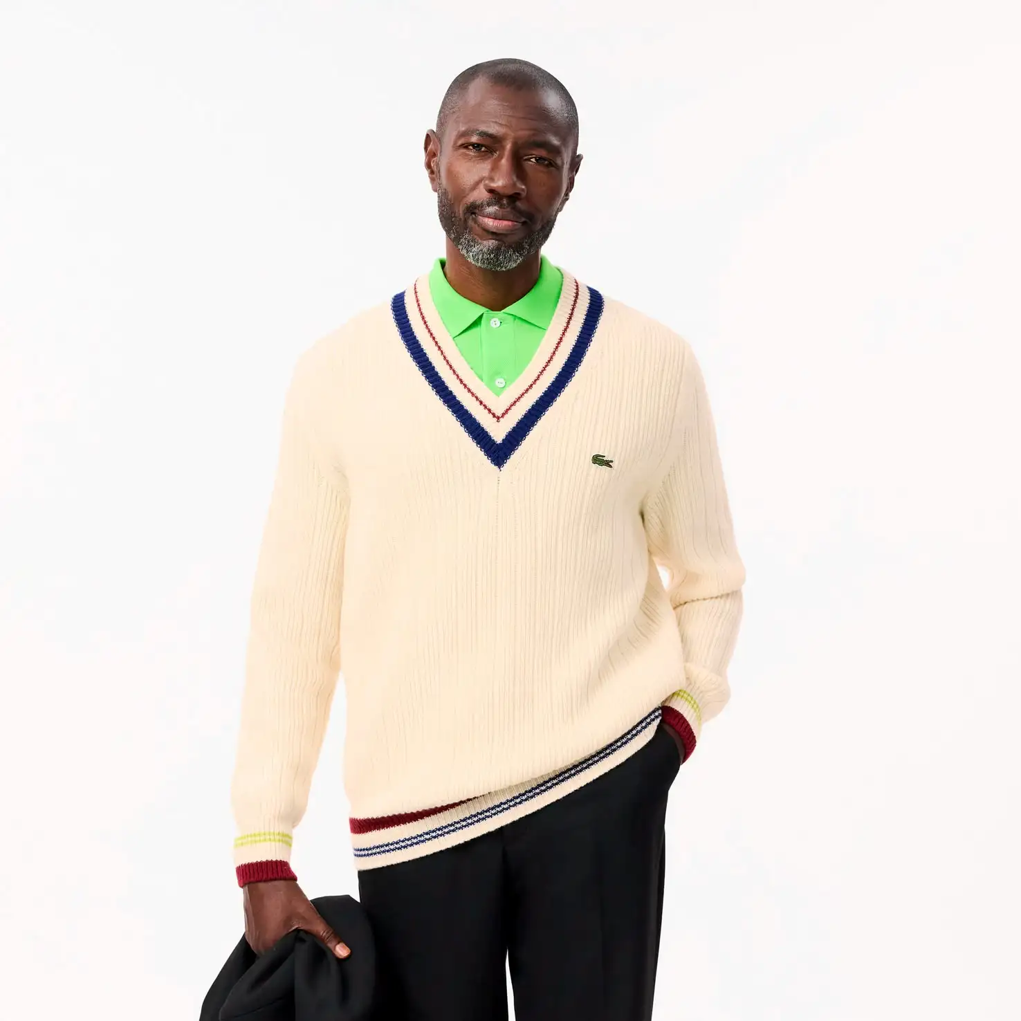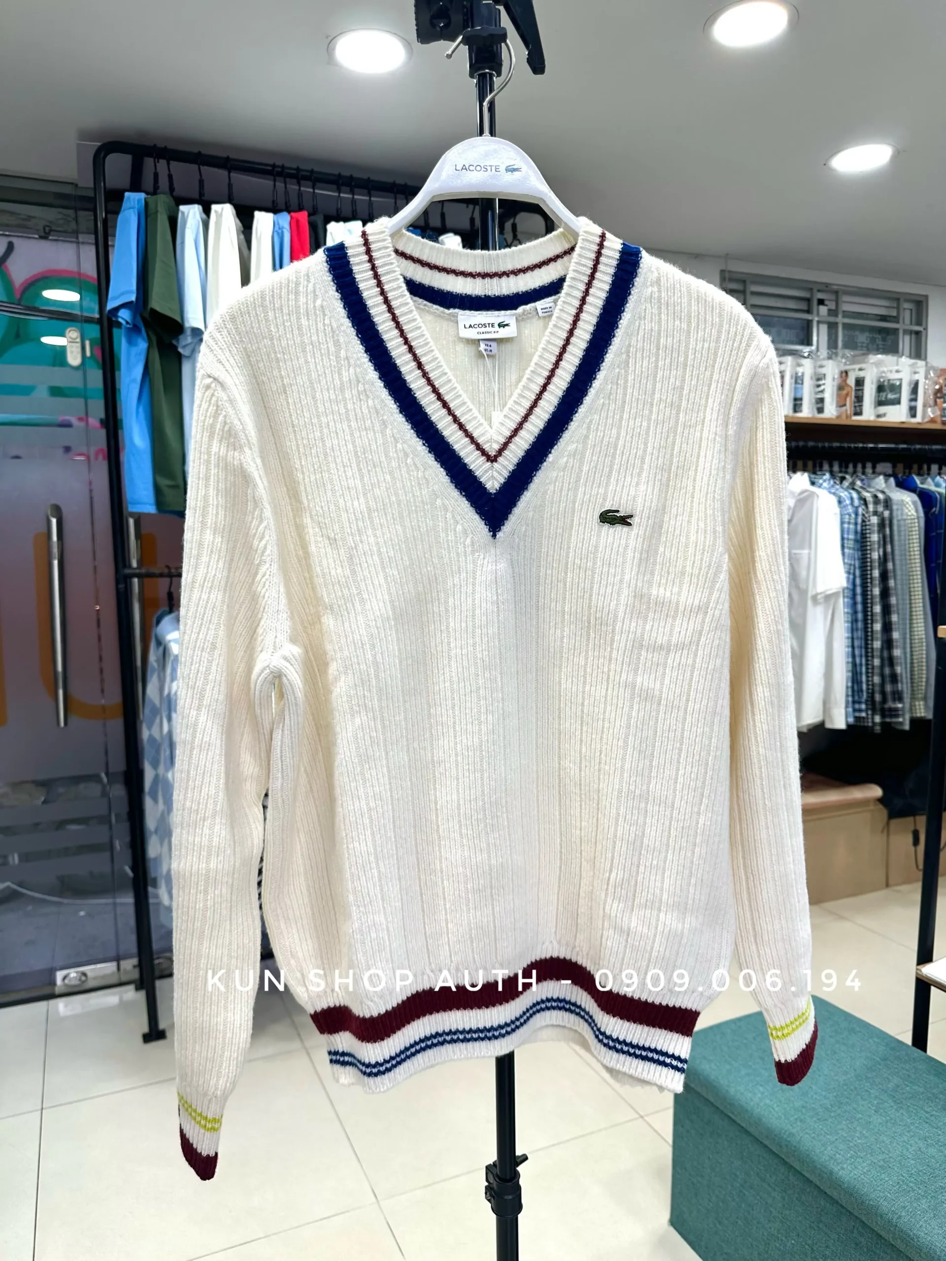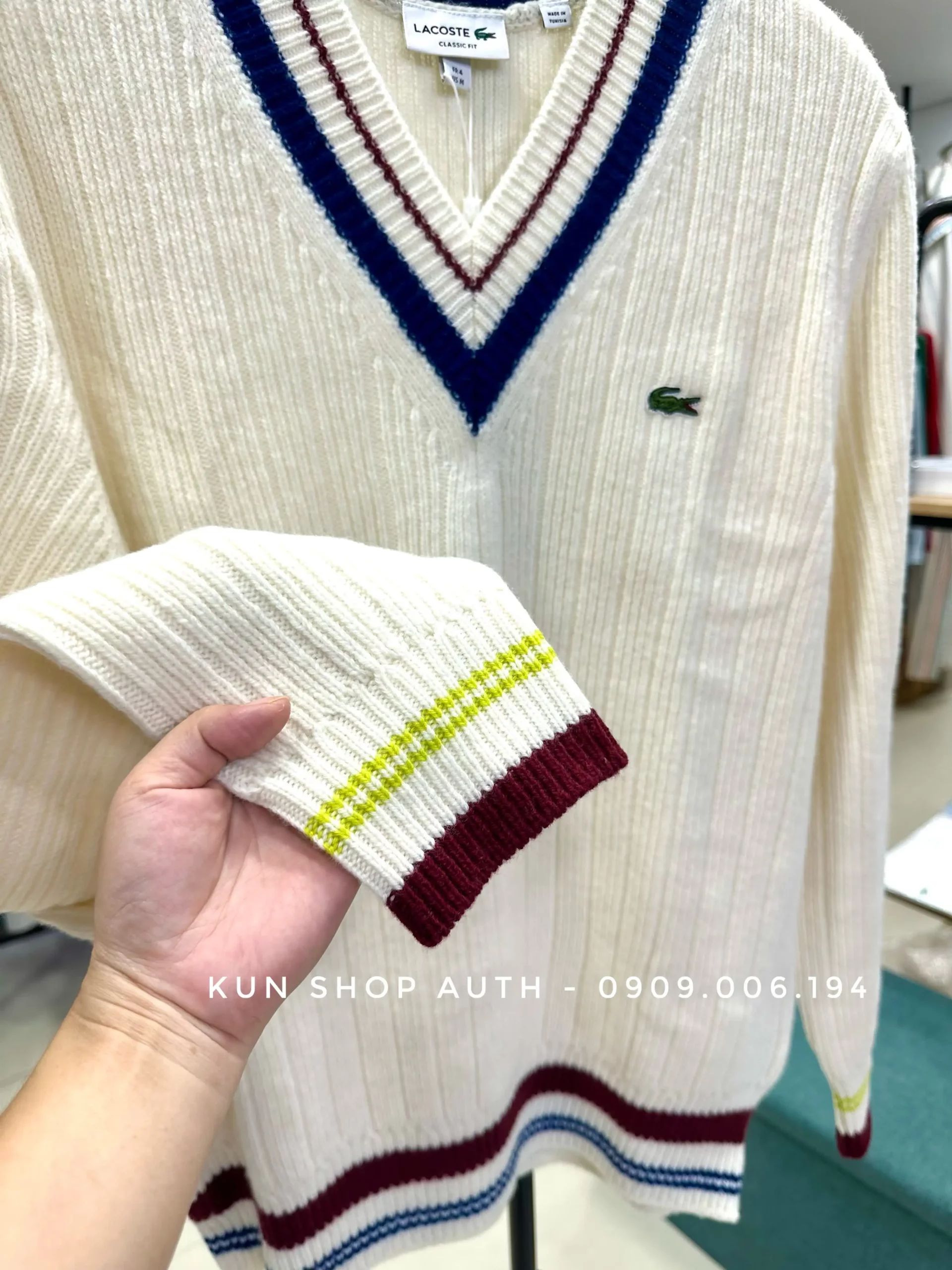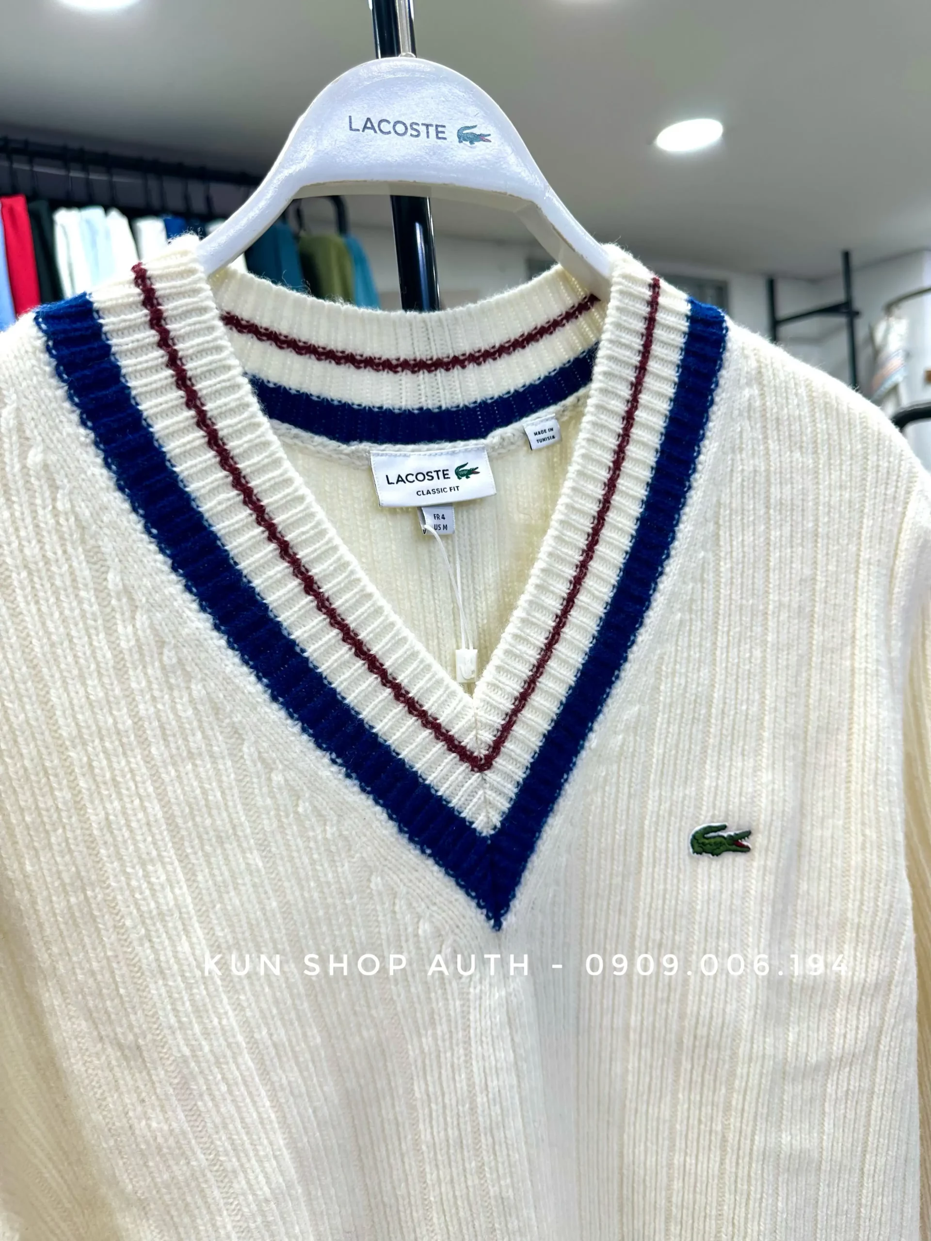 Áo len Lacoste, form CLASSIC FIT, thiết kế cổ áo chữ V độc đáo, logo cá sấu truyền thống, chất liệu 100% len, made in Tunisia