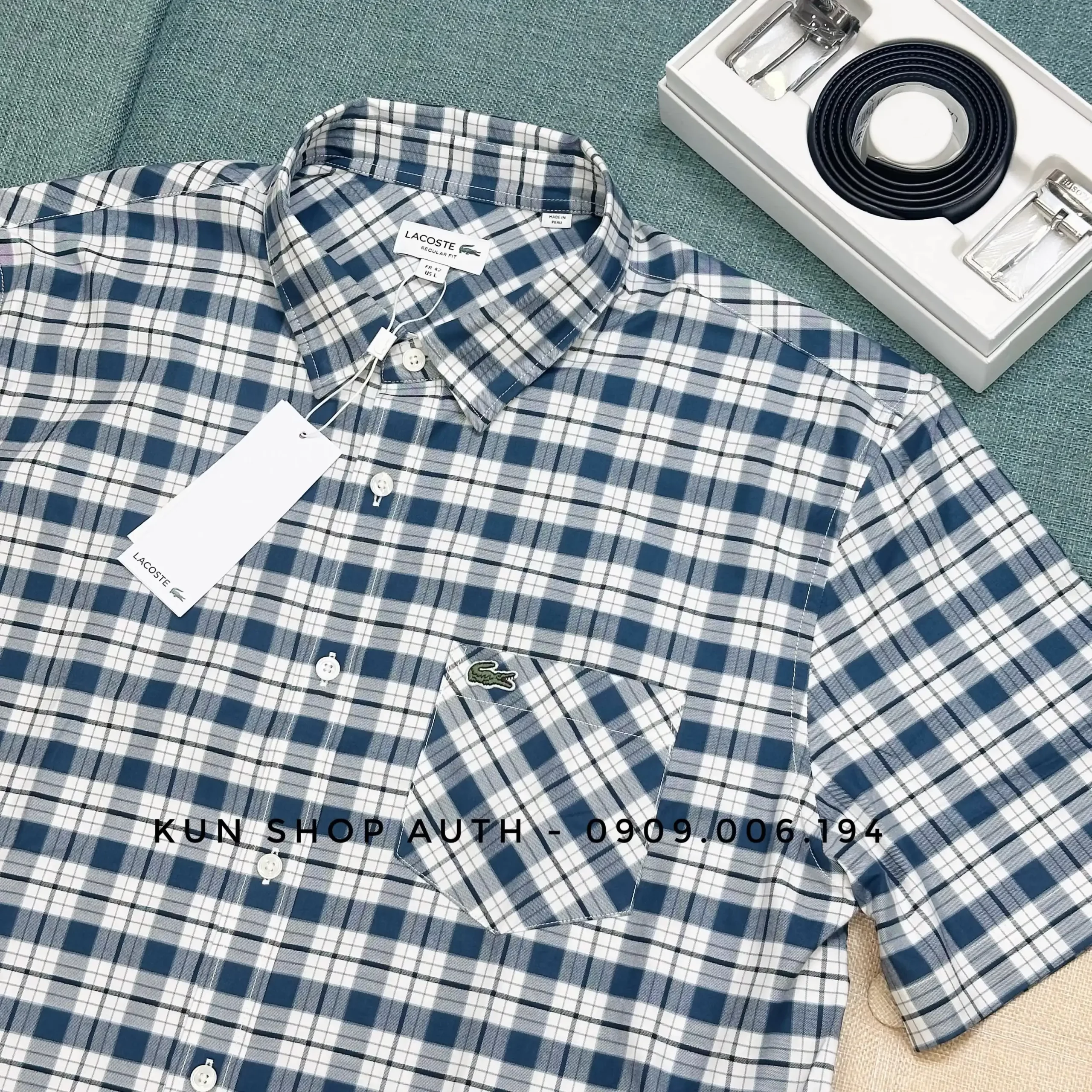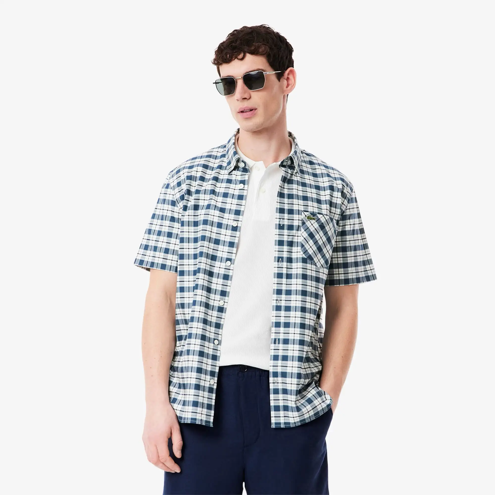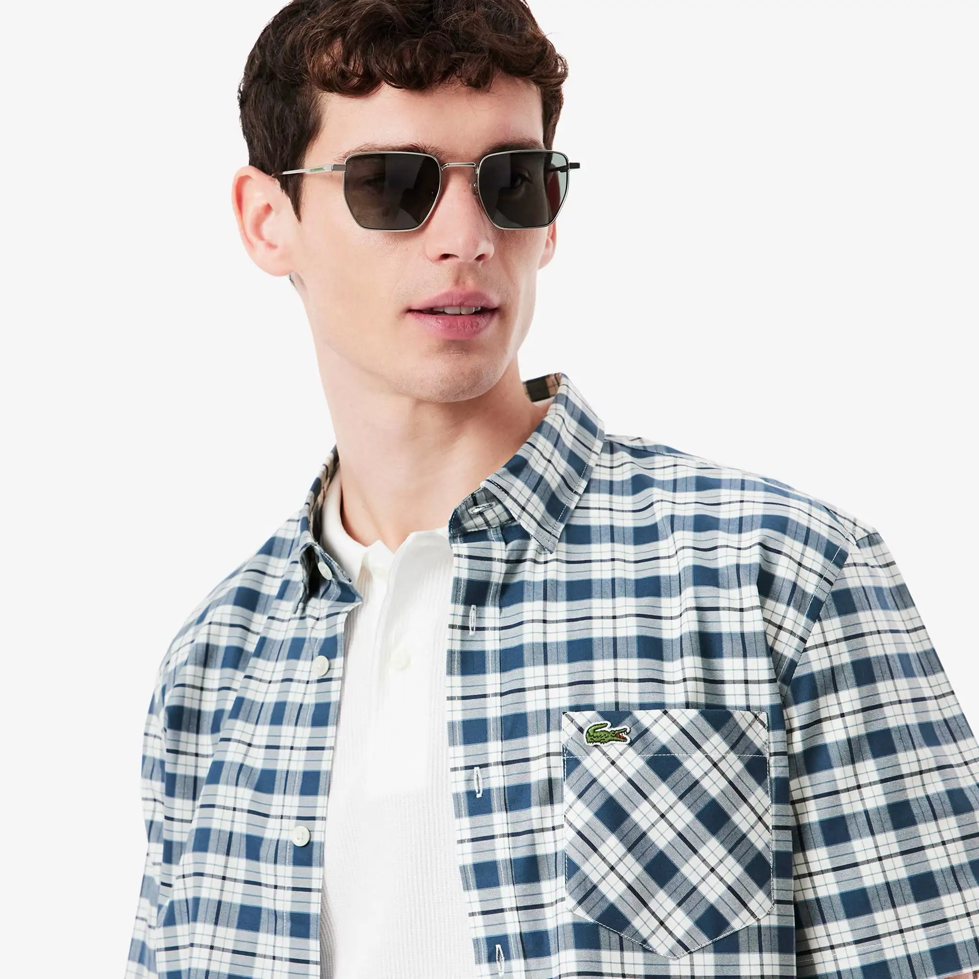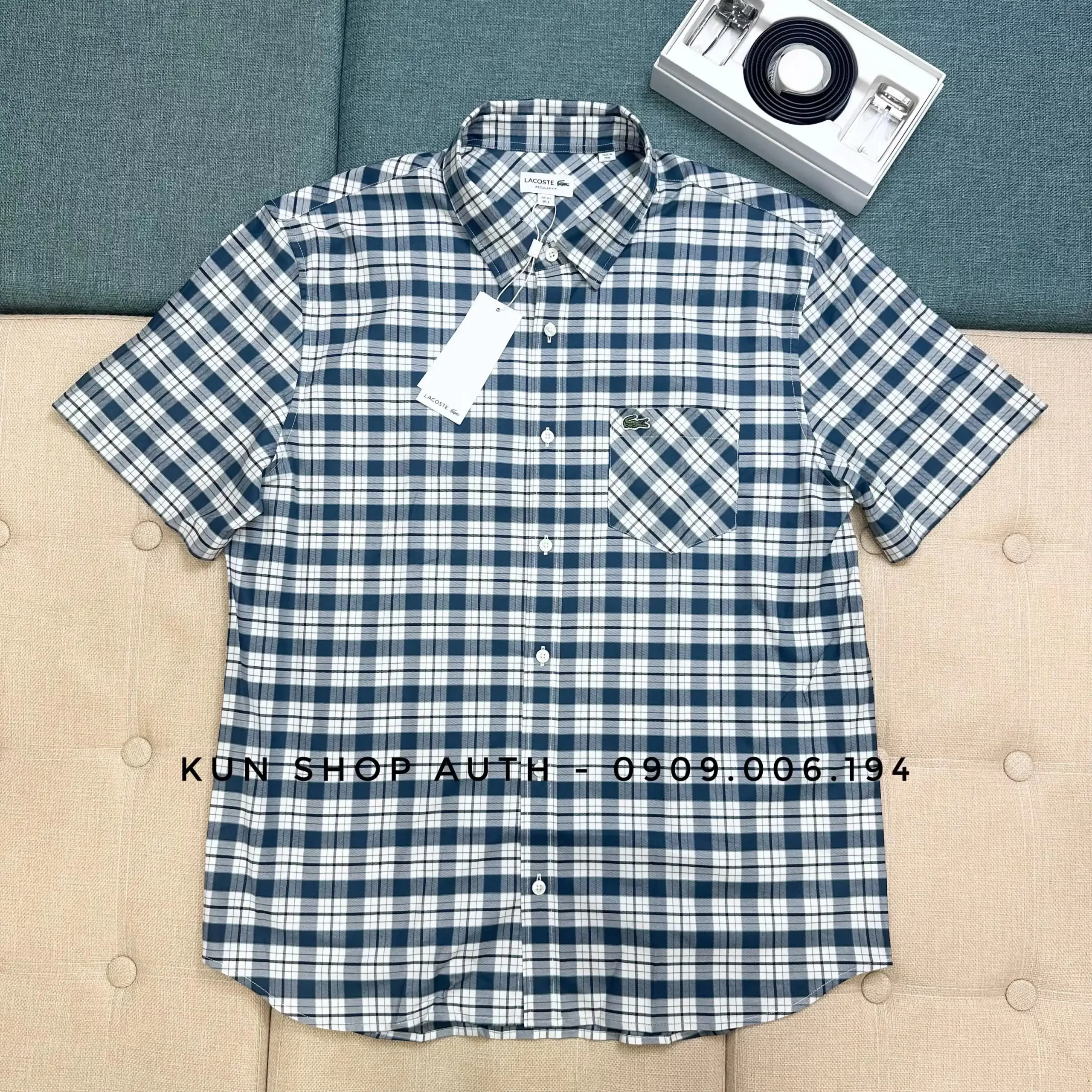 Áo sơmi tay ngắn Lacoste, form REGULAR FIT, thiết kế sọc caro, túi áo sọc caro nghiên 45 độ, logo cá sấu xanh, chất vải 100% cotton