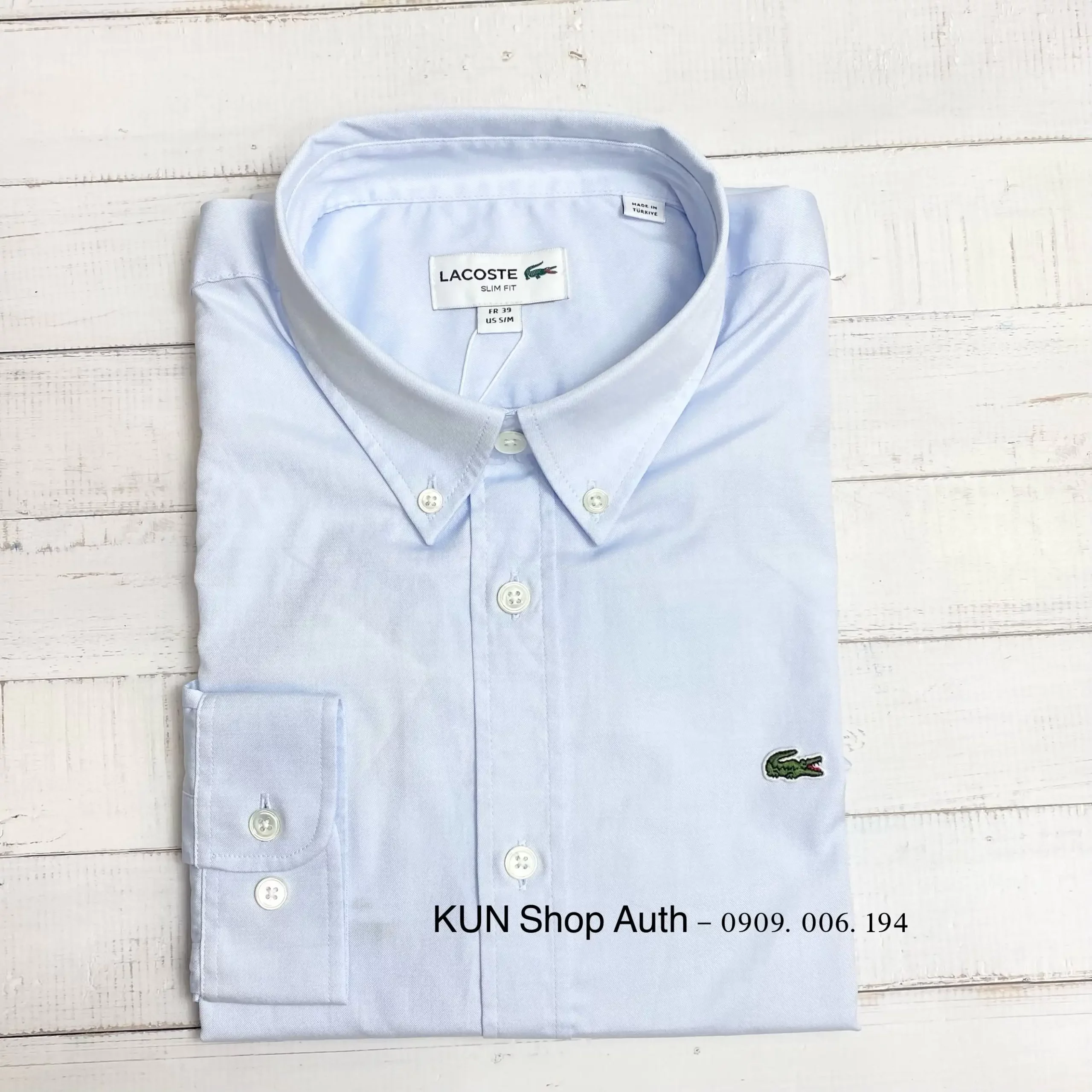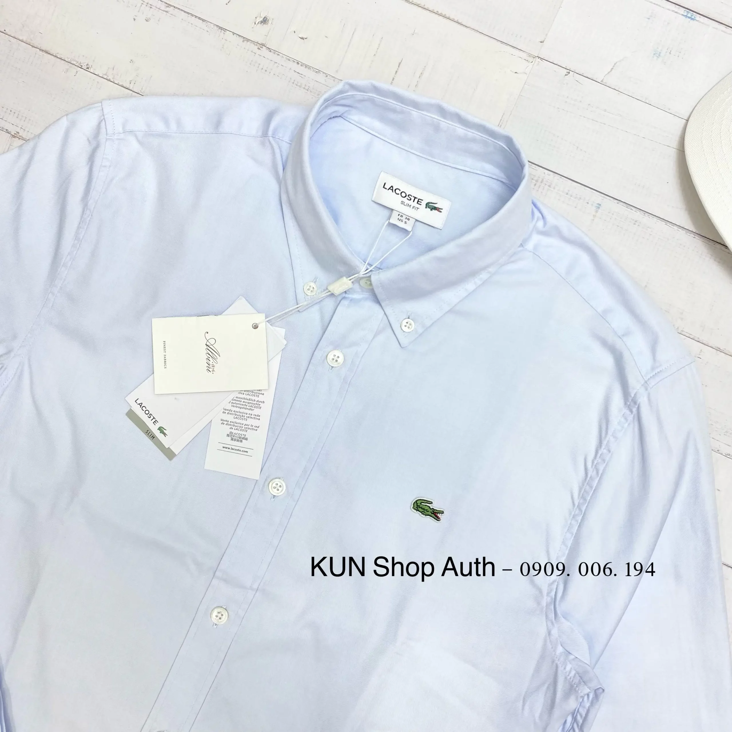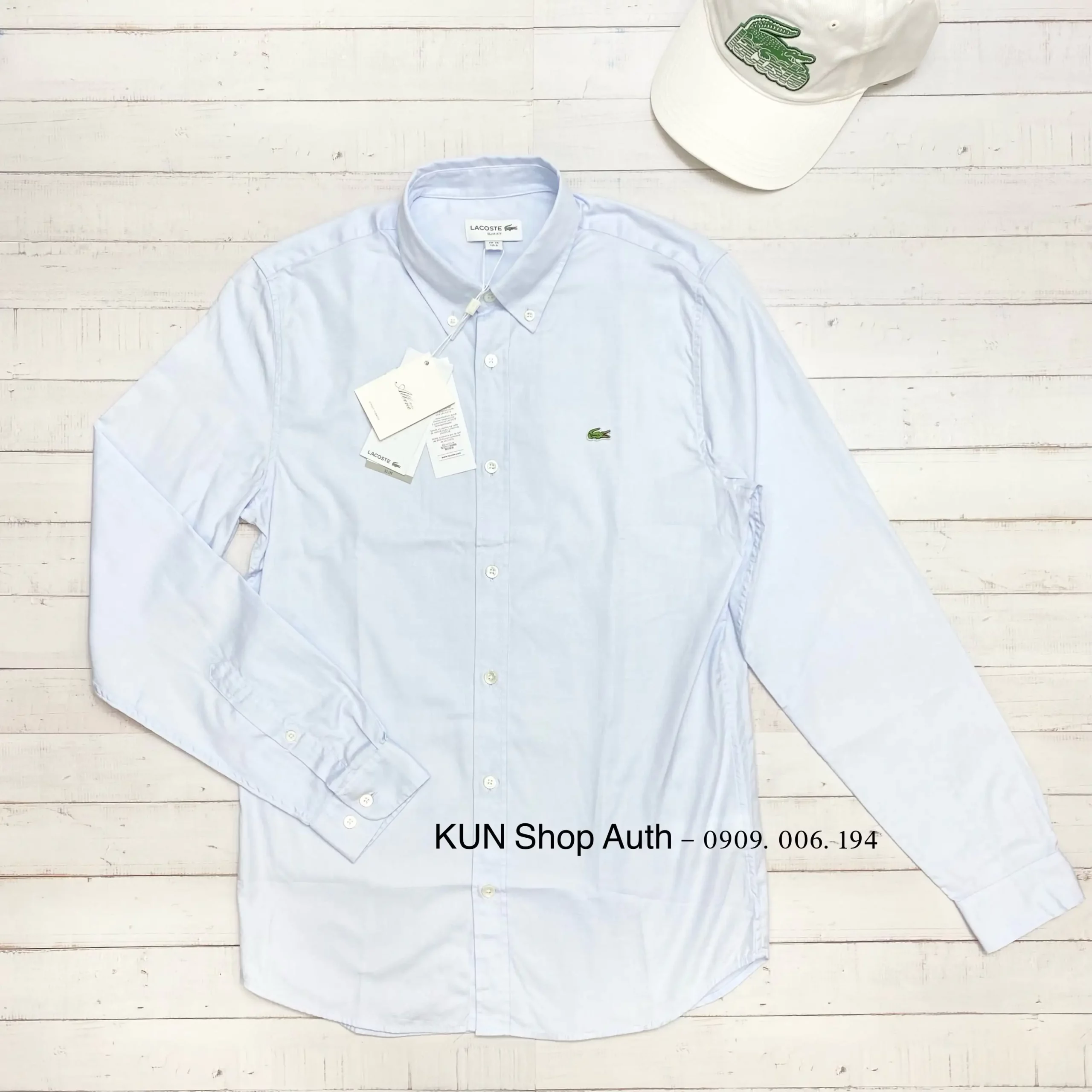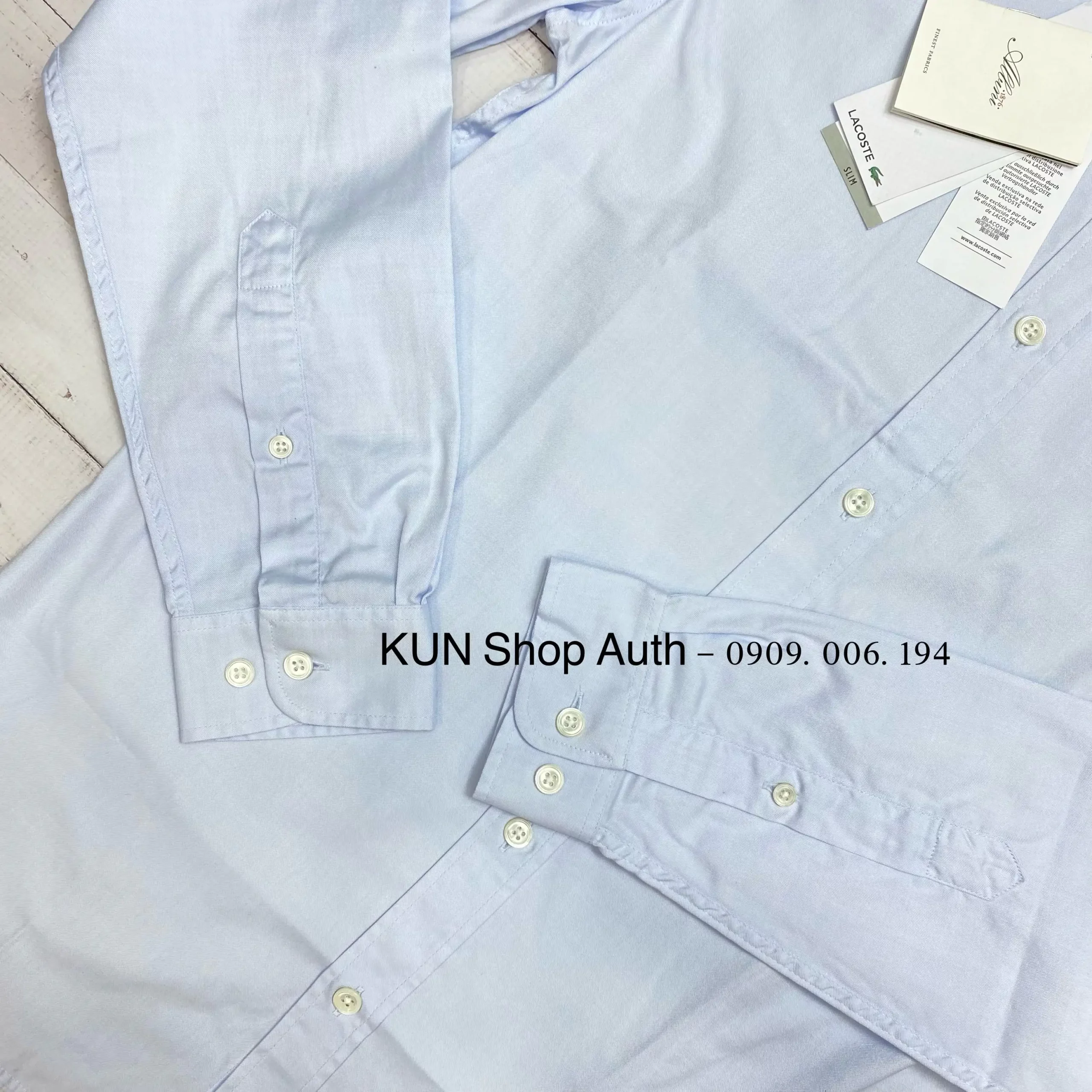 Áo sơmi Lacoste tay dài, form REGULAR FIT, màu trơn, không có túi áo, logo cá sấu xanh thêu, chất liệu 100% Albini cotton của Ý.