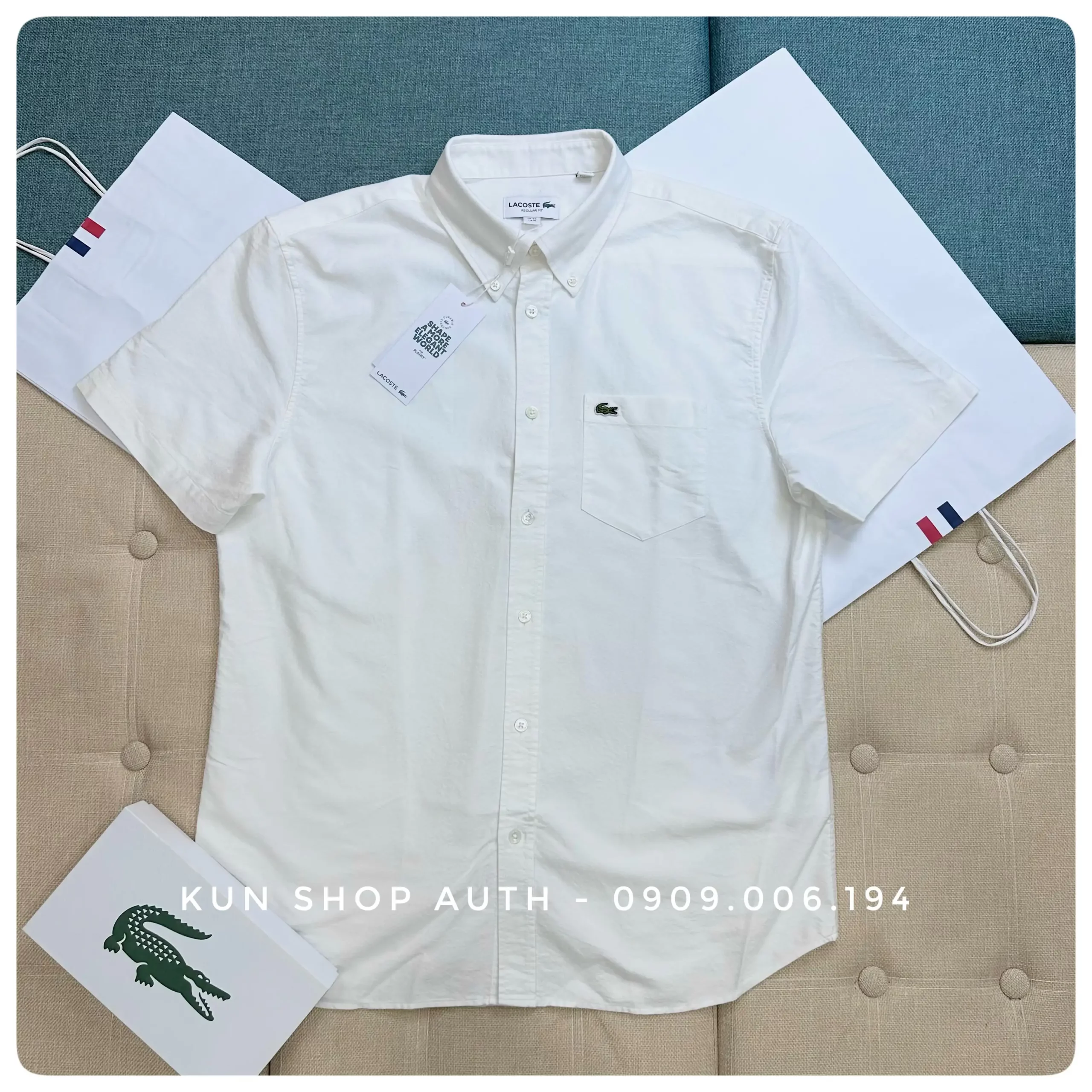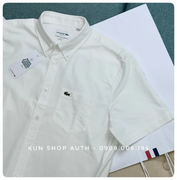 Áo sơmi tay ngắn Lacoste, form REGULAR FIT, màu trơn, có túi áo, logo cá sấu xanh, chất vải 100% Oxford cotton.