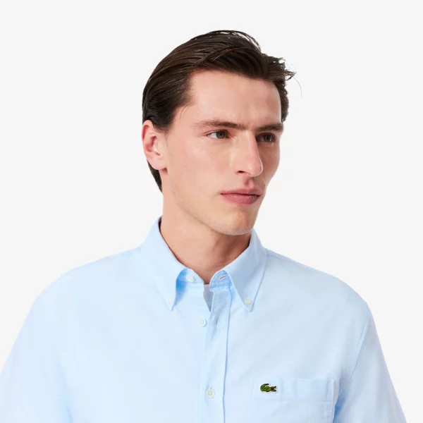 Áo sơmi tay ngắn Lacoste, form REGULAR FIT, màu trơn, có túi áo, logo cá sấu xanh, chất vải 100% Oxford cotton.