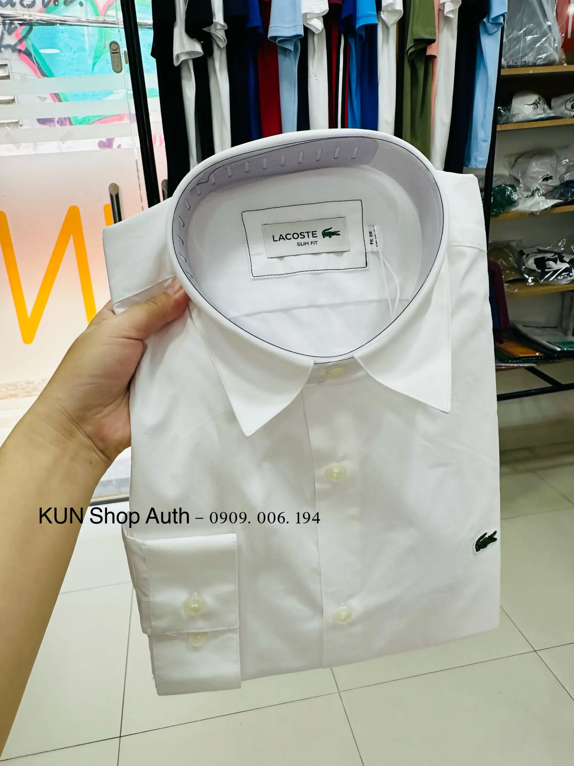 Áo sơmi tay dài Lacoste, form SLIM FIT, màu trơn, không có túi áo, logo cá sấu xanh, chất vải 100% Poplin cotton.
