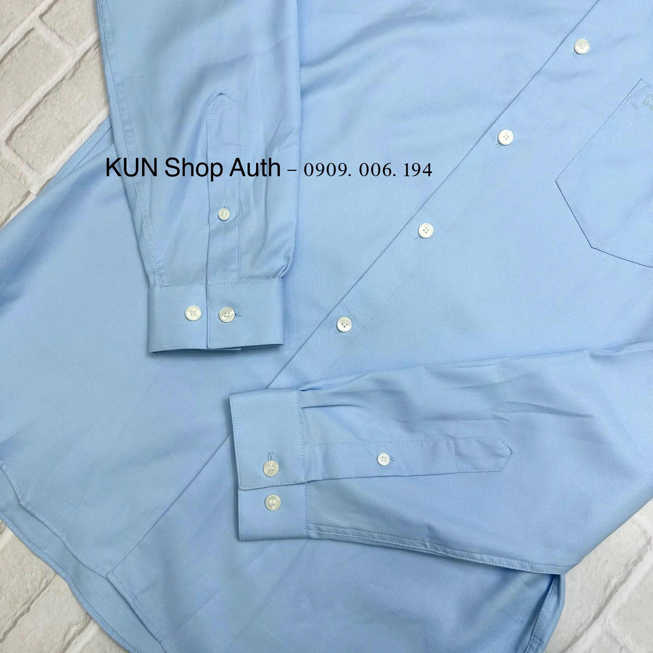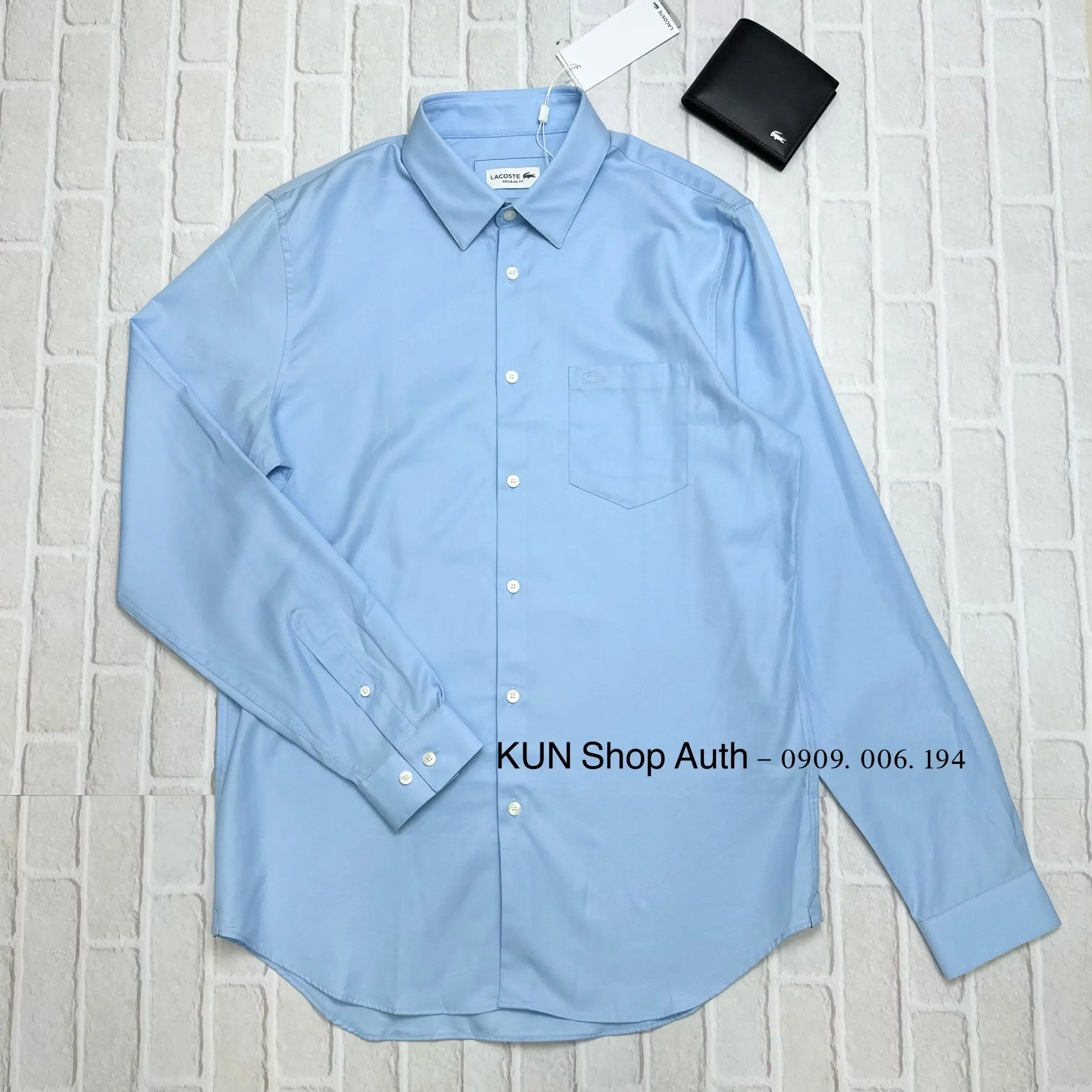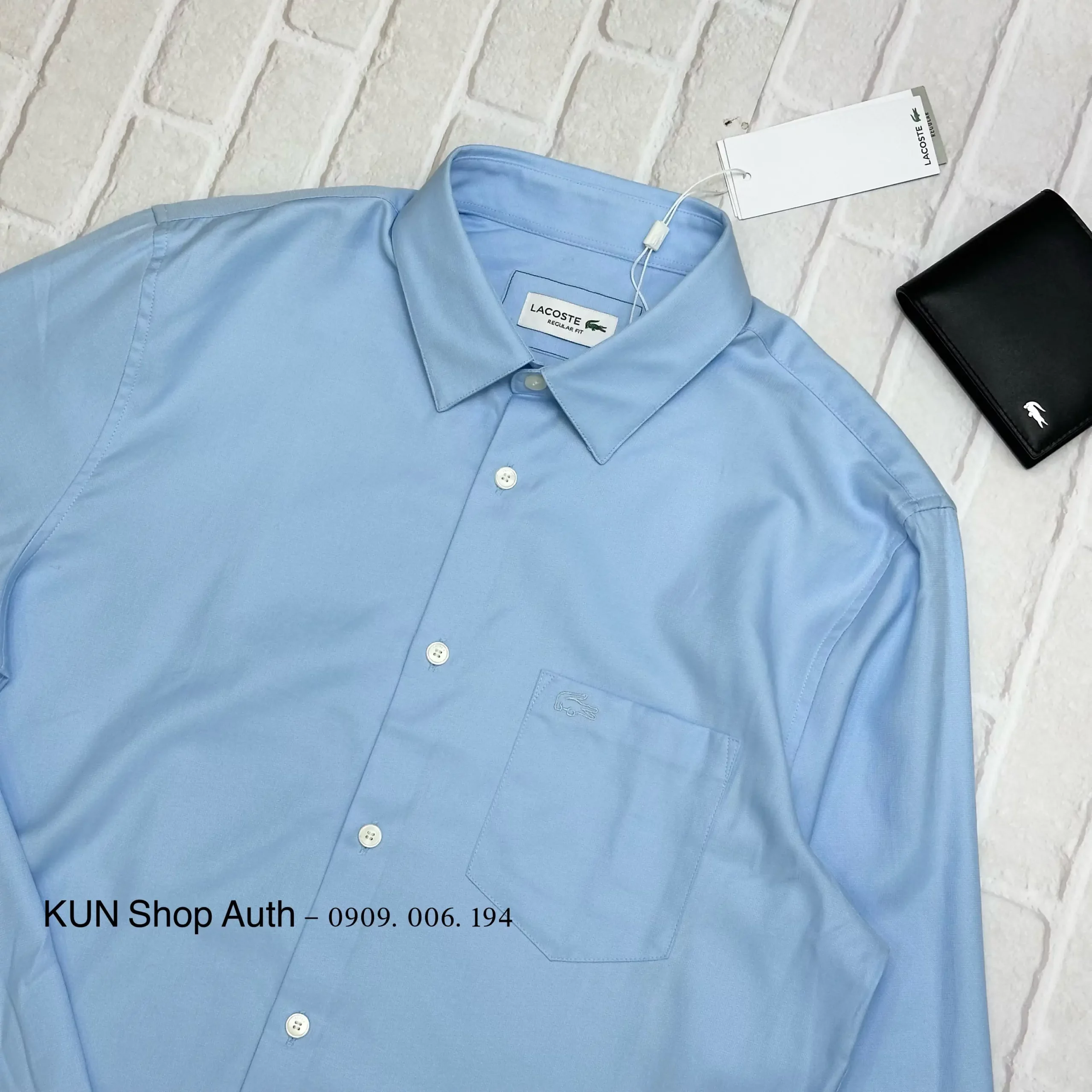 Áo sơmi tay dài Lacoste, form REGULAR FIT, màu trơn, logo cá sấu xanh da trời thêu trên túi áo ngực trái, chất vải 100% Poplin cotton, vải gân.
