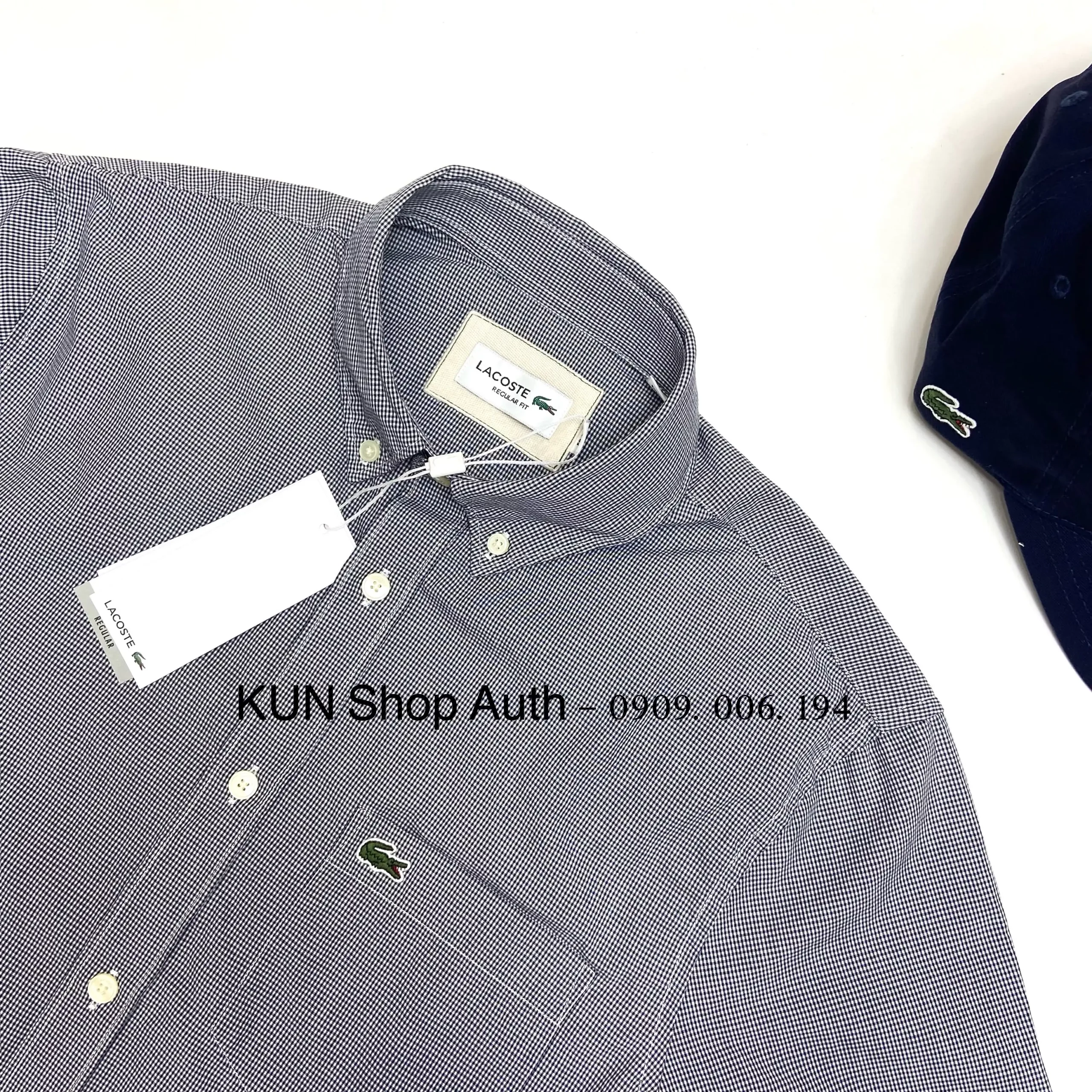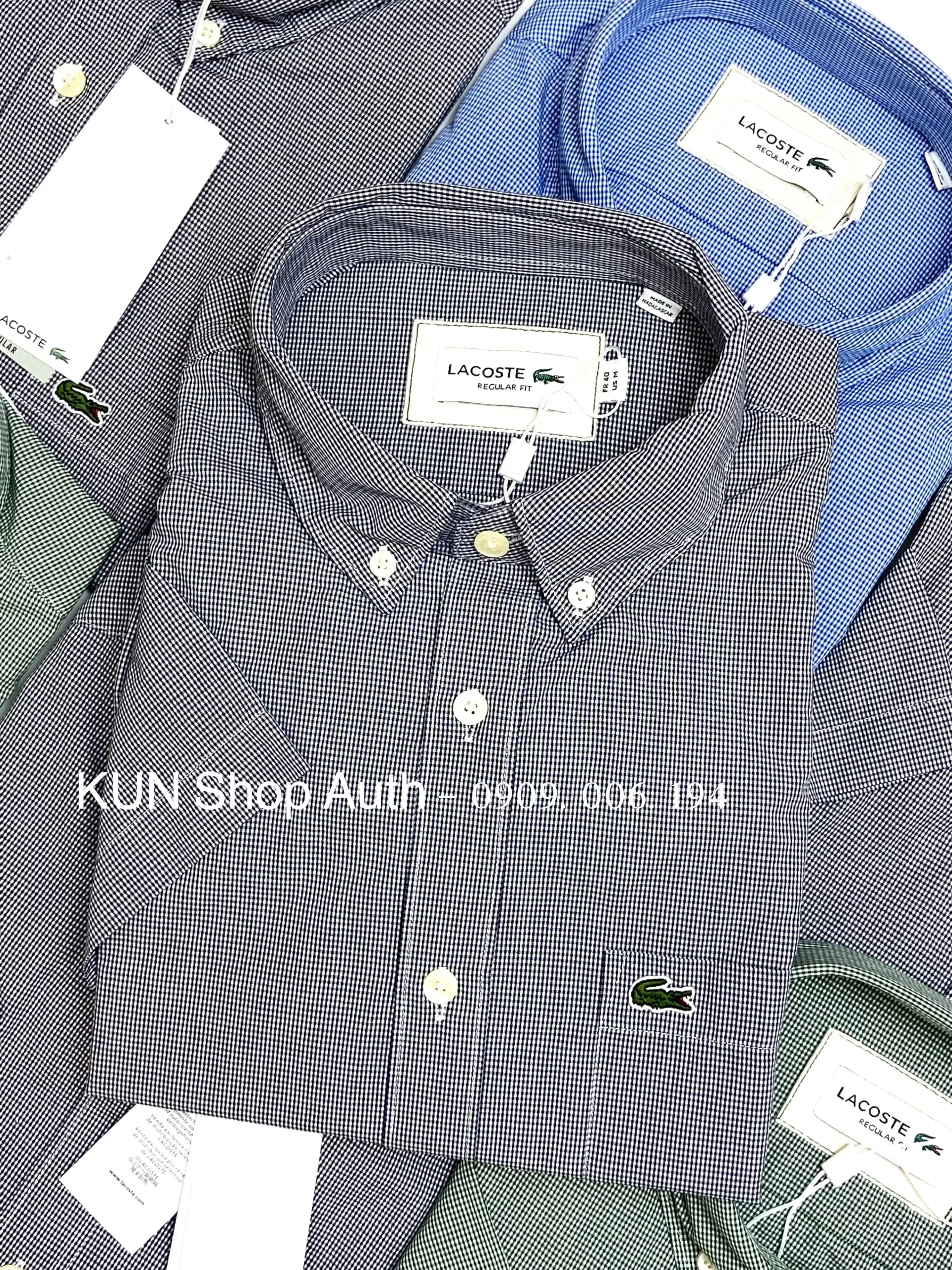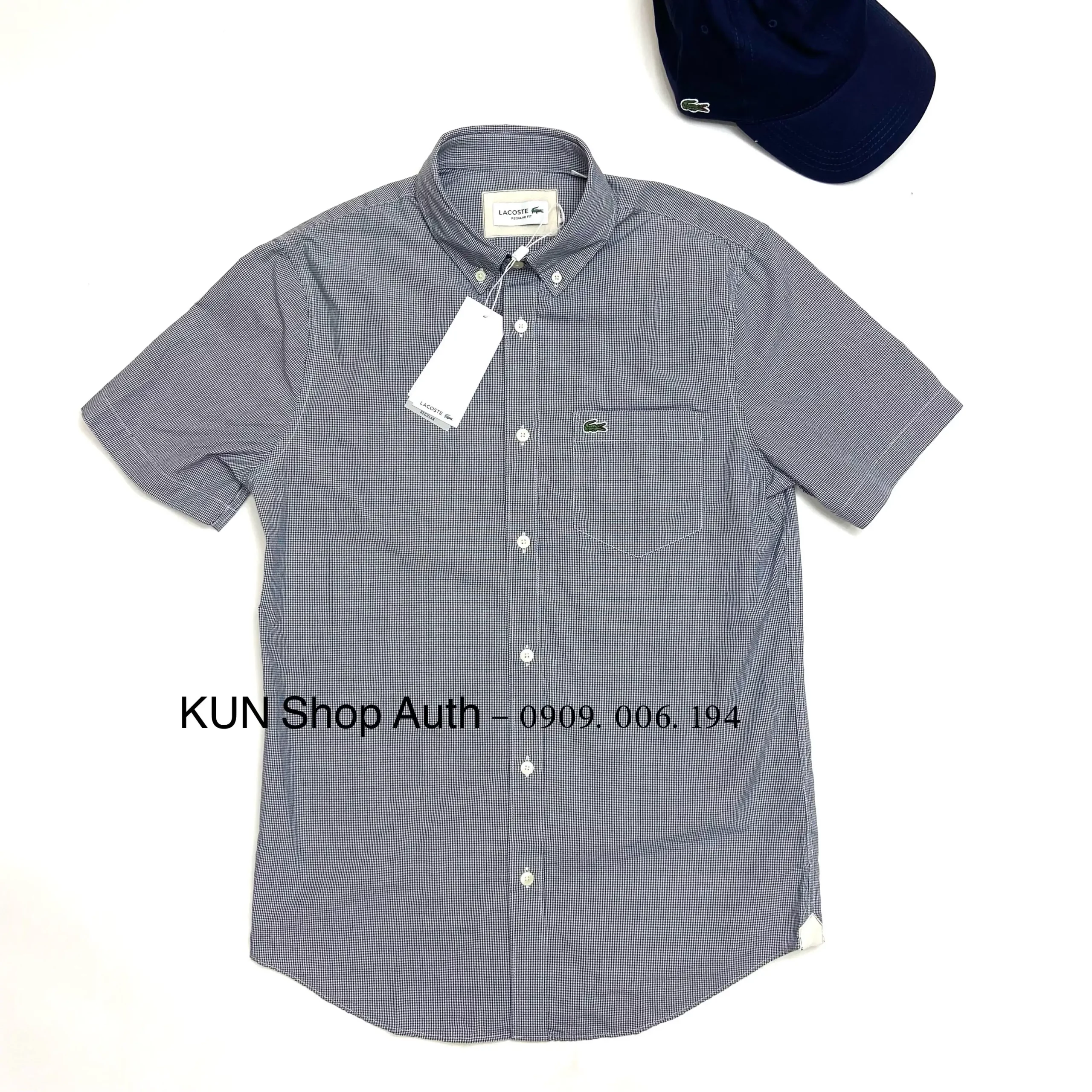 Áo sơmi Lacoste tay ngắn, form REGULAR FIT, có túi áo, sọc caro nhuyễn, logo cá sấu xanh thêu, chất liệu 100% cotton