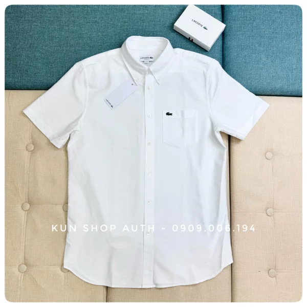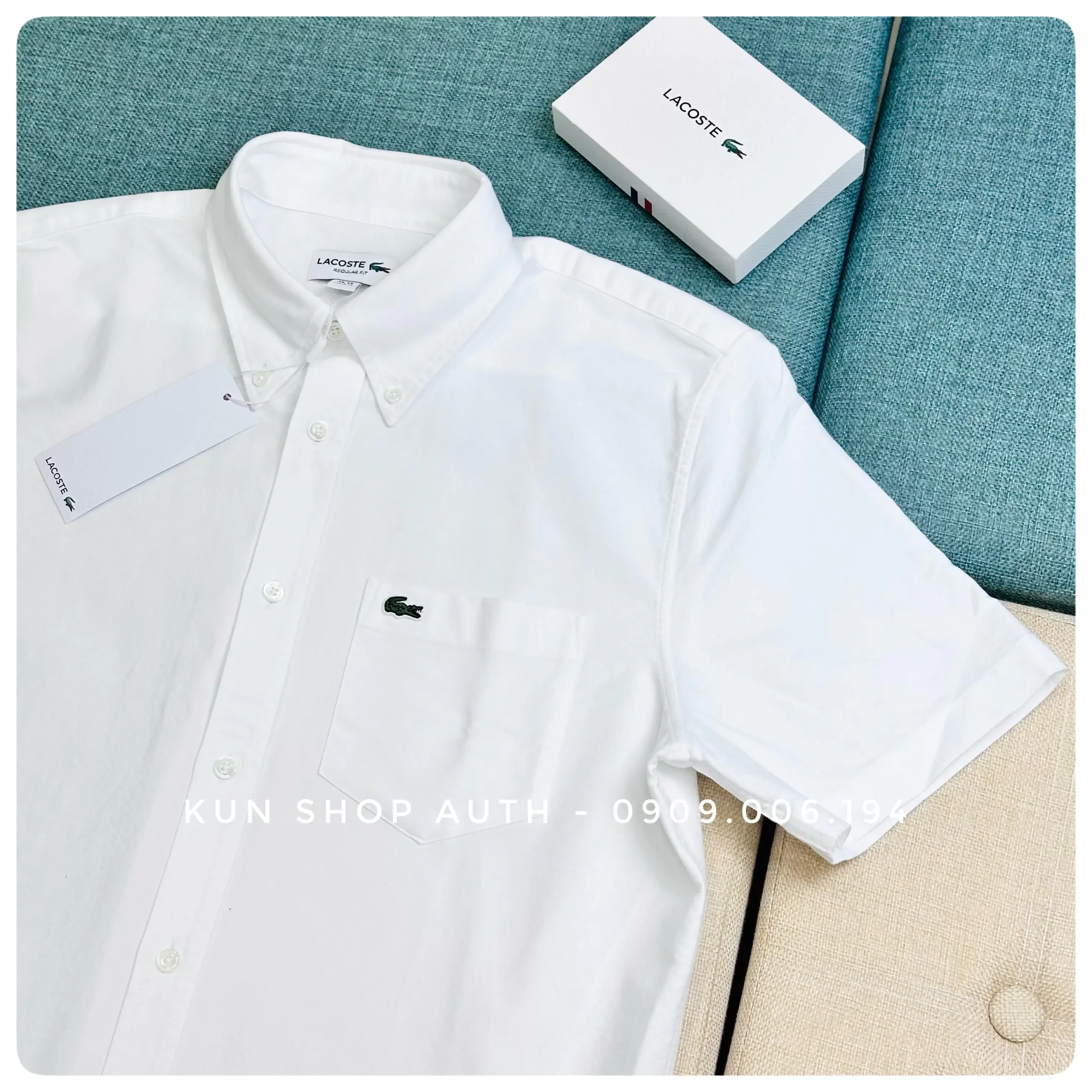 Áo sơmi tay ngắn Lacoste, form REGULAR FIT, màu trơn, có túi áo, logo cá sấu xanh, chất vải 100% Oxford cotton.