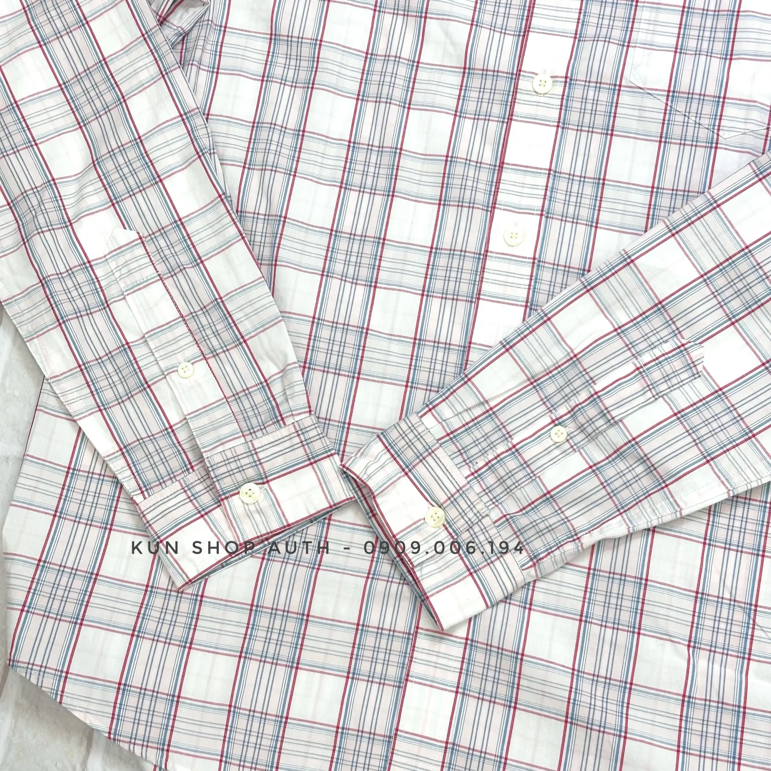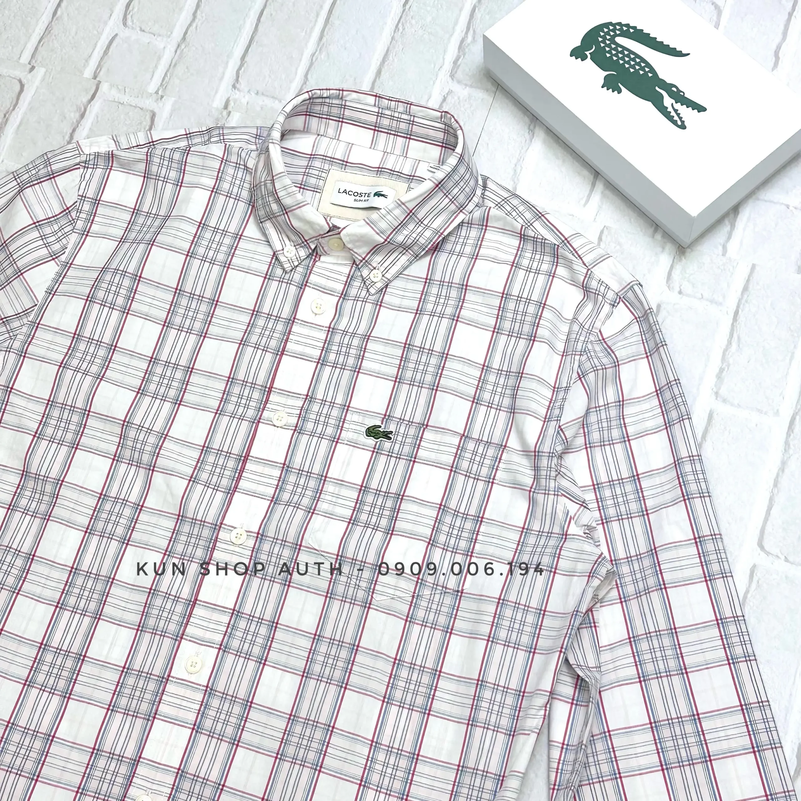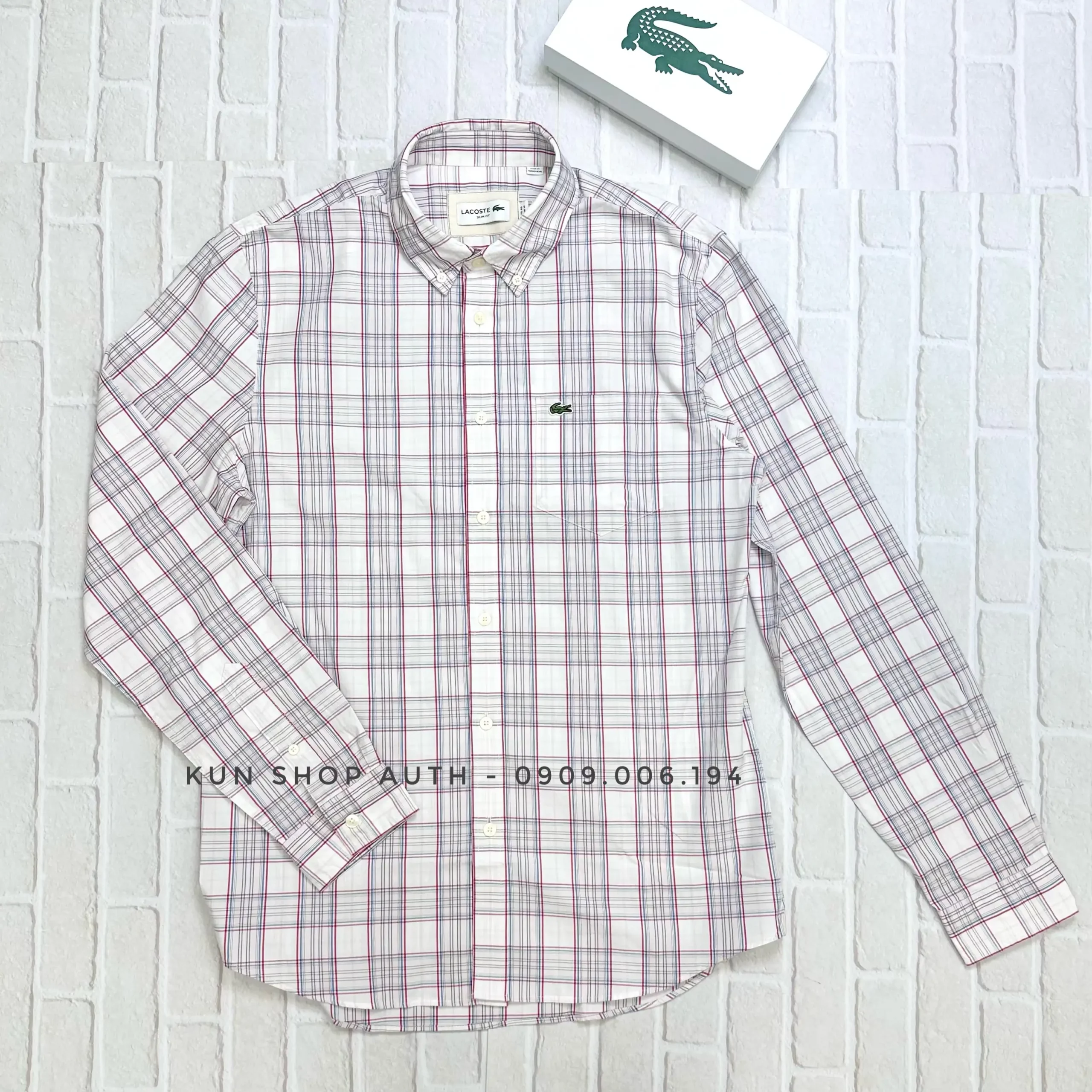 Áo sơmi tay dài Lacoste, form SLIM FIT, thiết kế sọc caro, có túi áo, logo cá sấu xanh, chất vải 98% cotton pha 2% Elastane