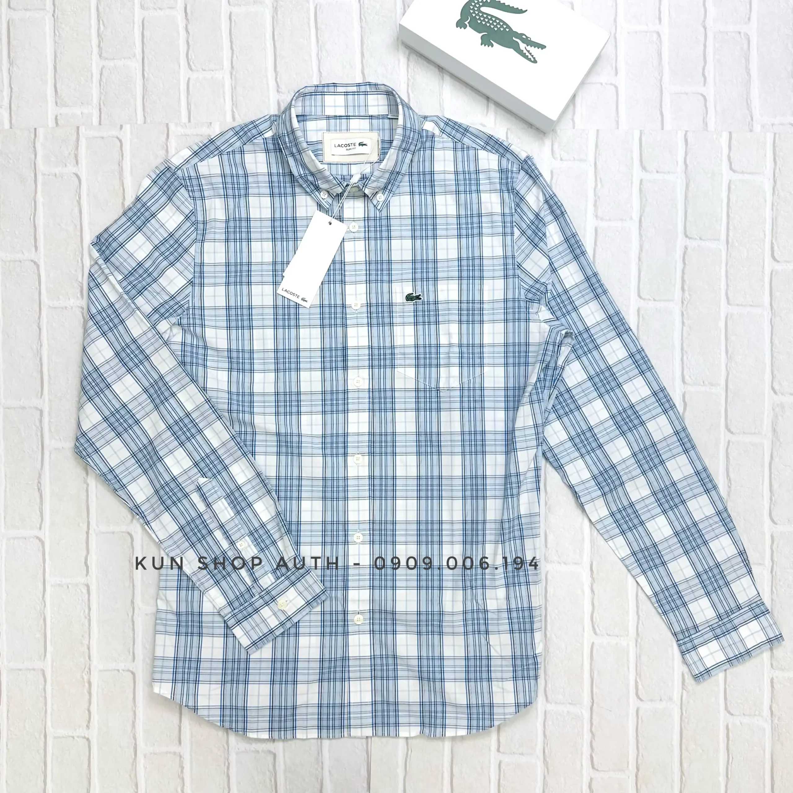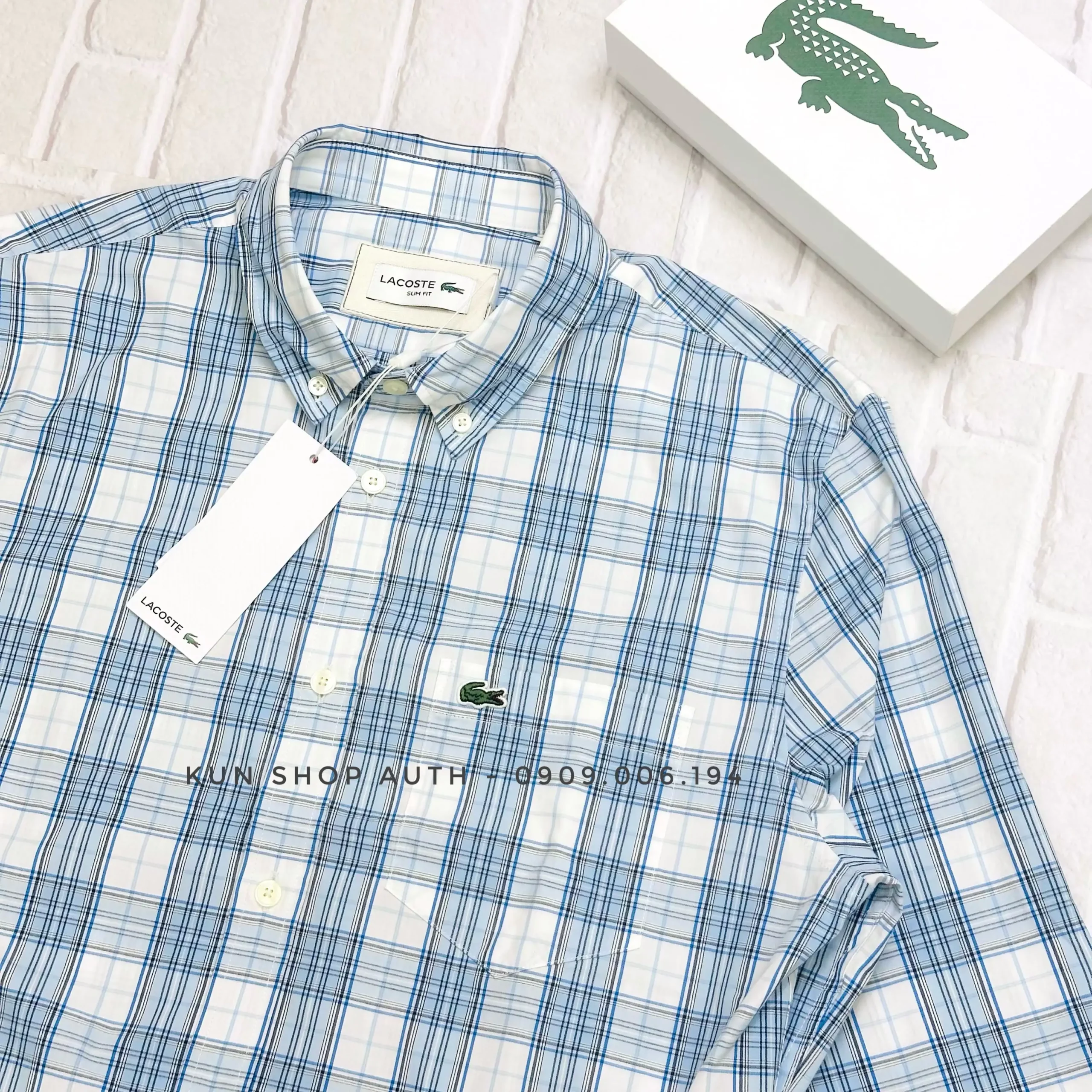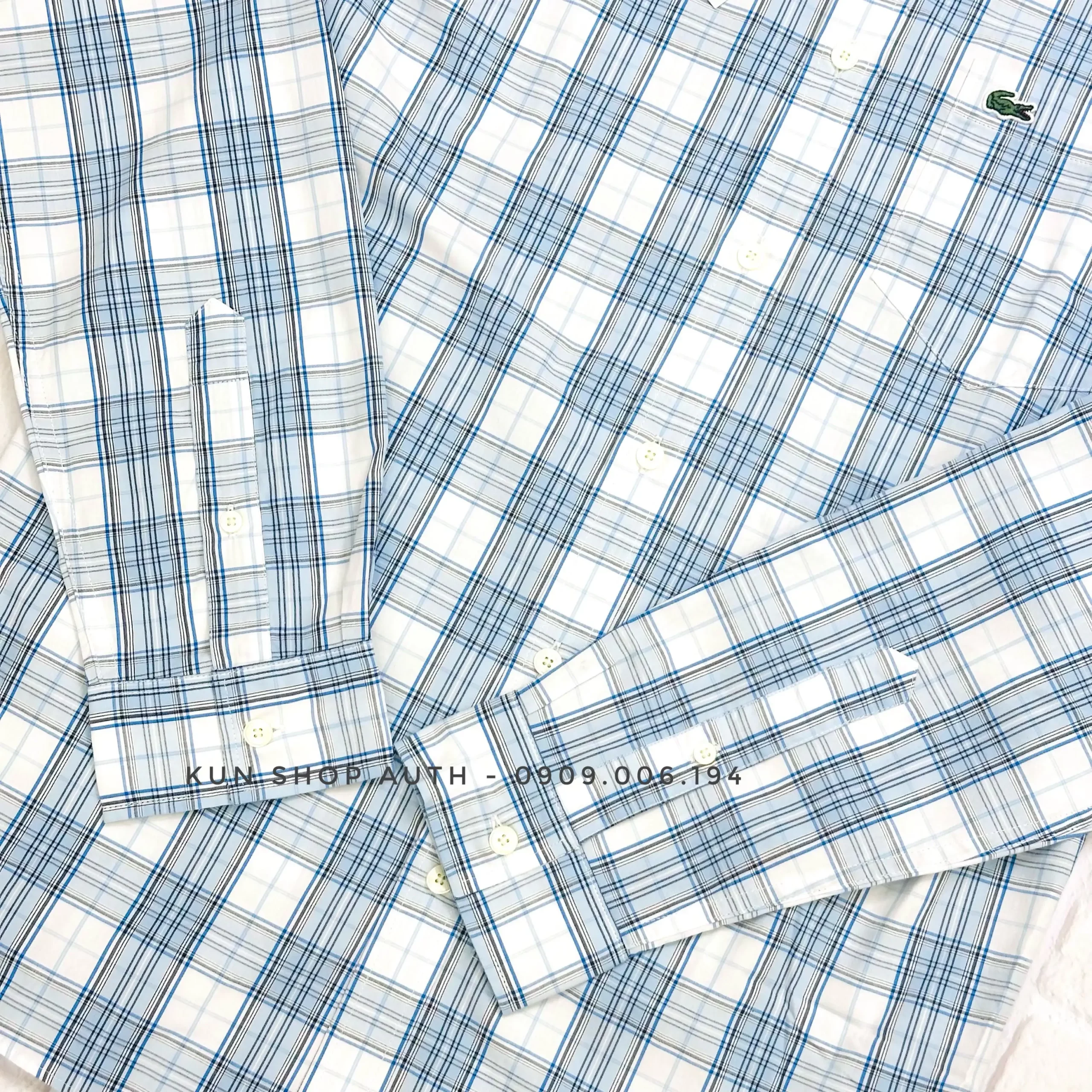 Áo sơmi tay dài Lacoste, form SLIM FIT, thiết kế sọc caro, có túi áo, logo cá sấu xanh, chất vải 98% cotton pha 2% Elastane