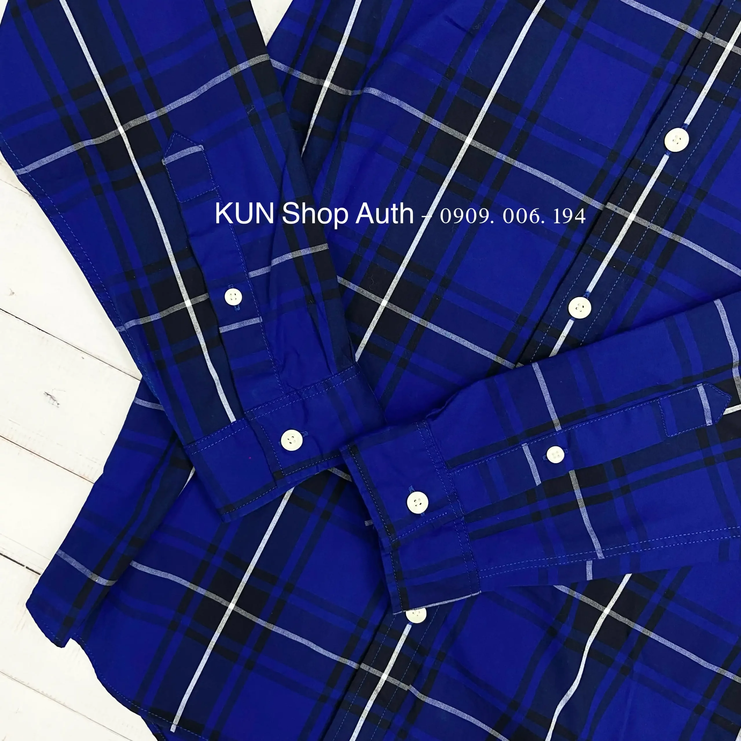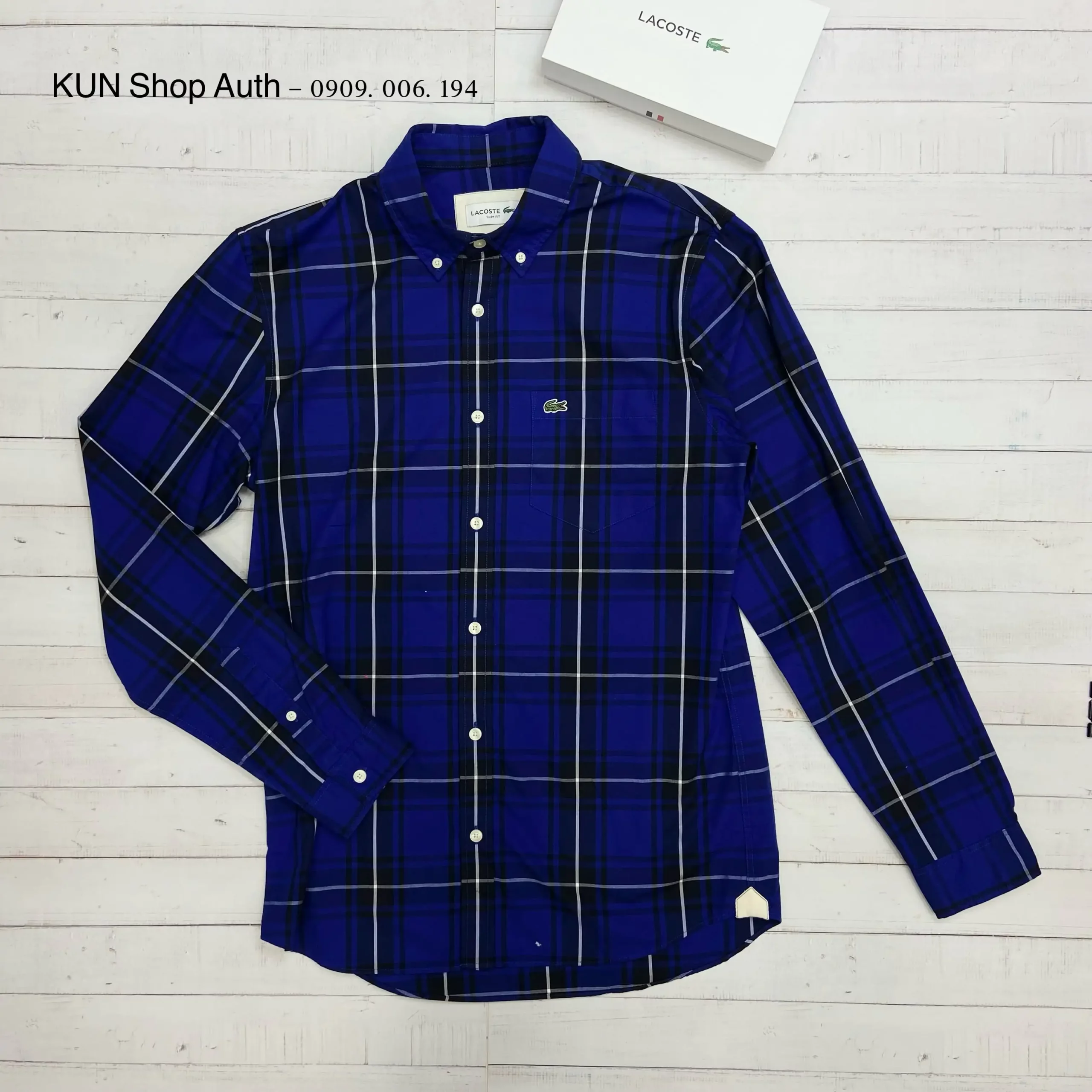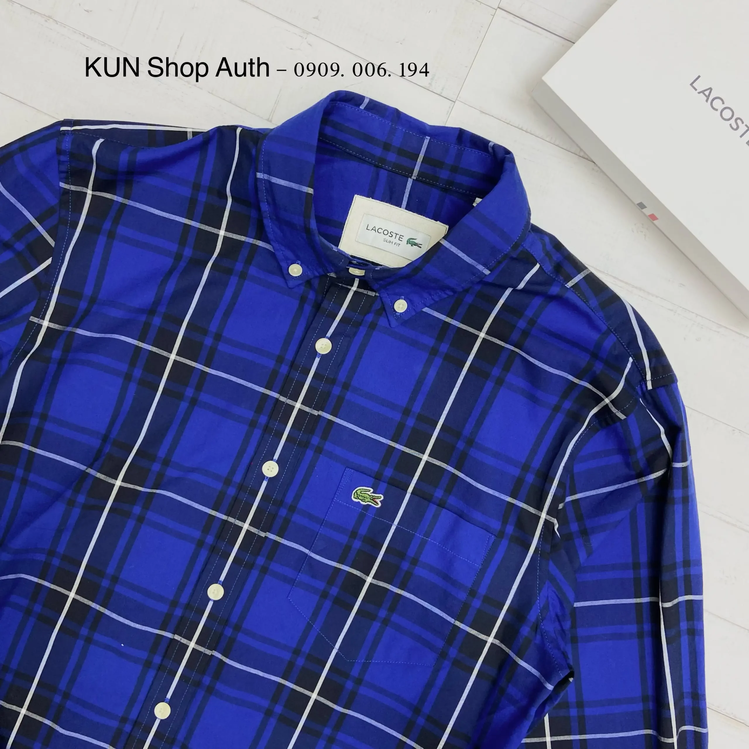 Áo sơmi tay dài Lacoste, form SLIM FIT, thiết kế sọc caro to, có túi áo, logo cá sấu xanh, chất vải 98% Poplin cotton pha 2% Elastane