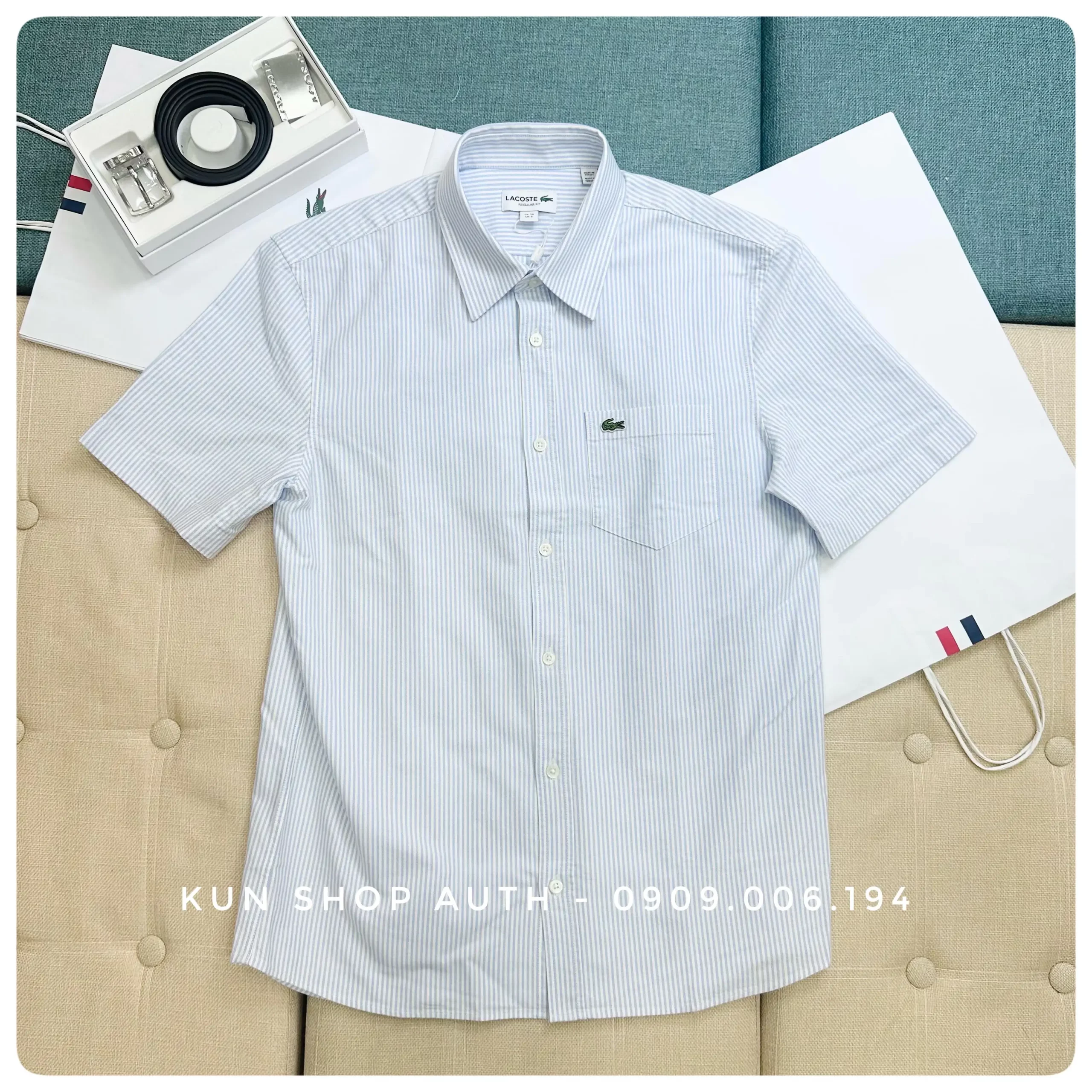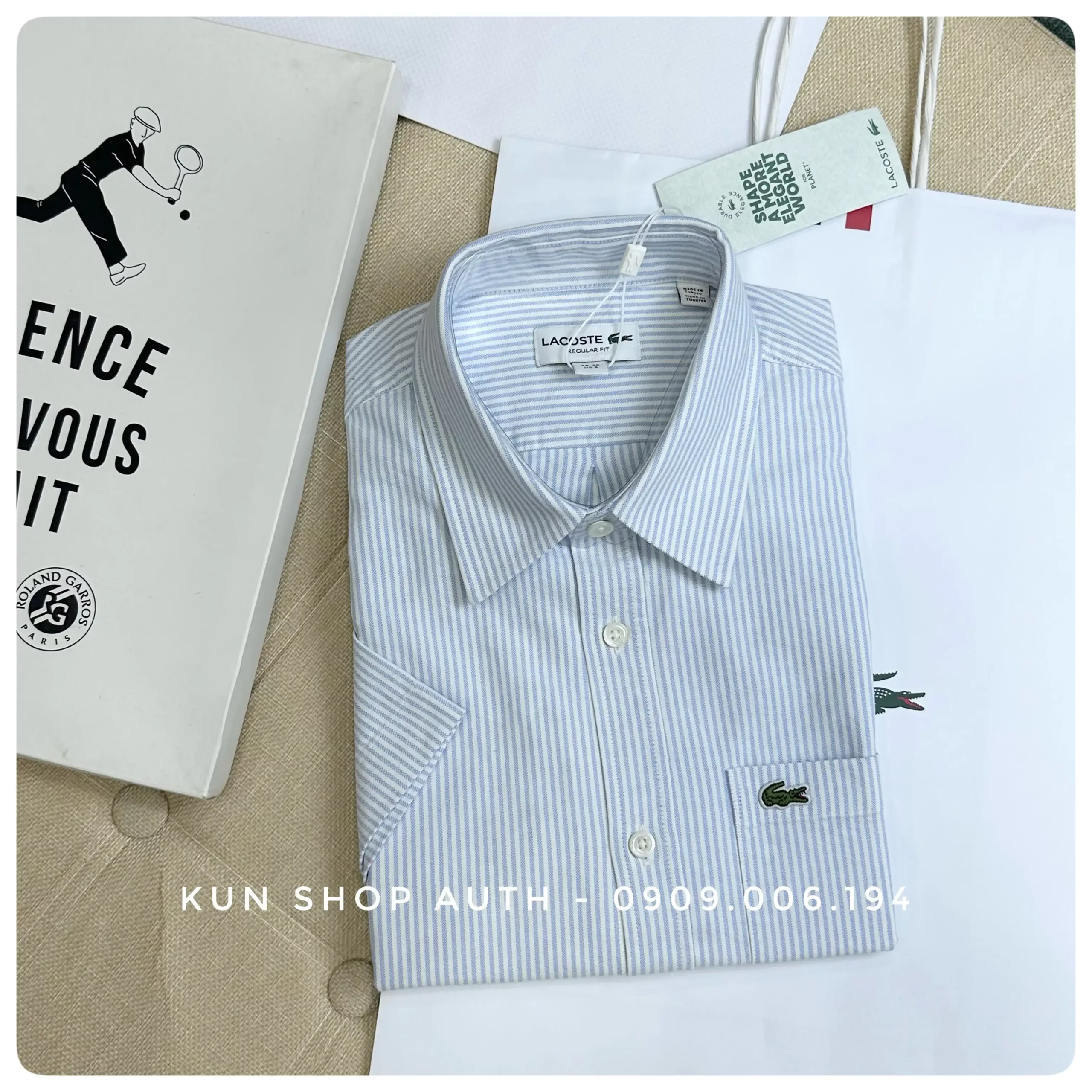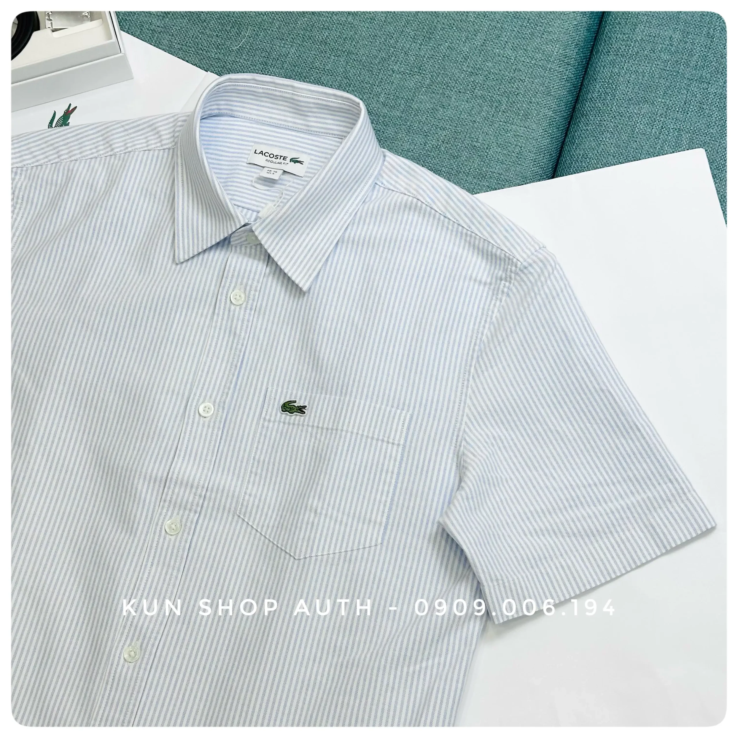 Áo sơmi Lacoste tay ngắn, form REGULAR FIT, sọc đứng, có túi áo, logo cá sấu xanh, chất vải 100% oxford cotton.