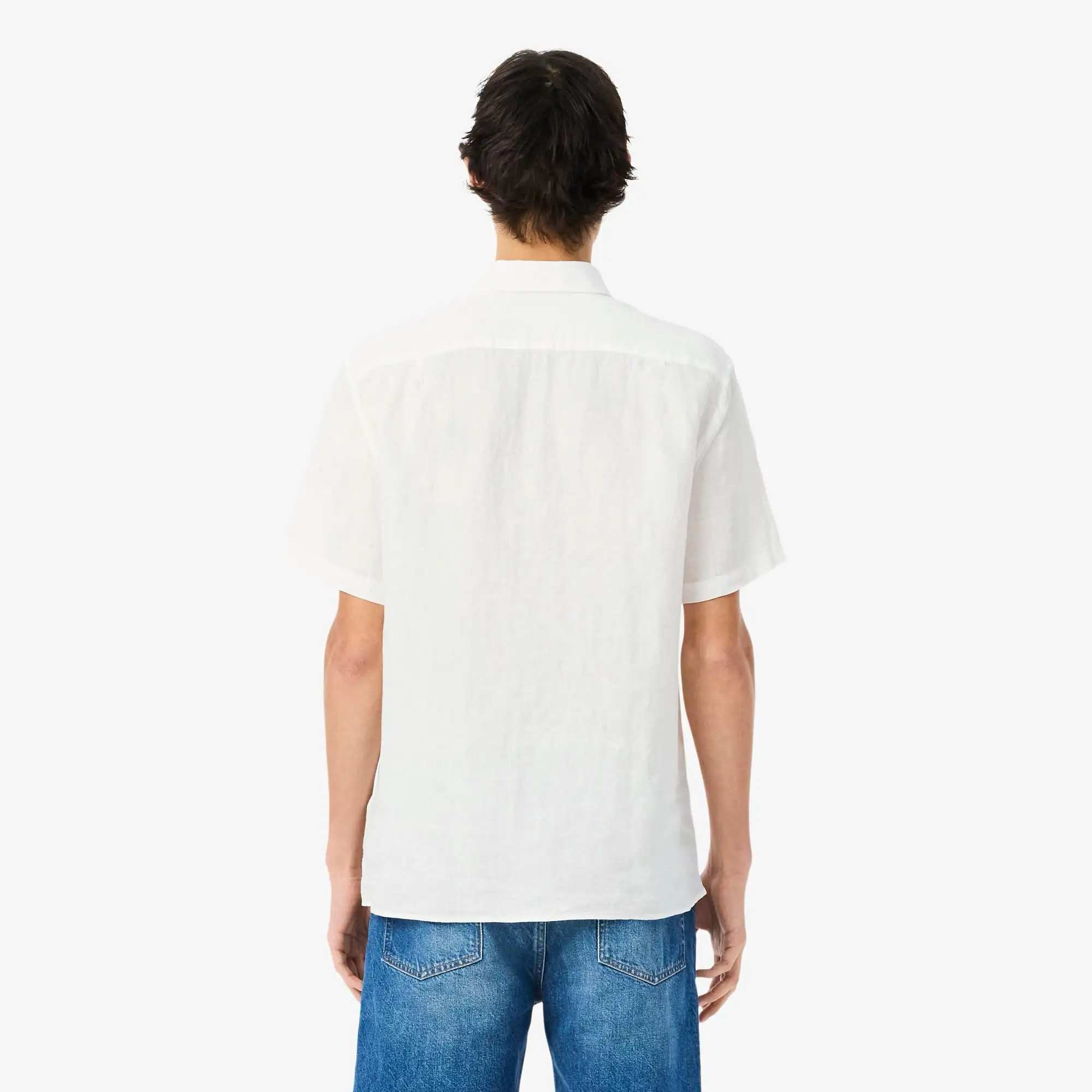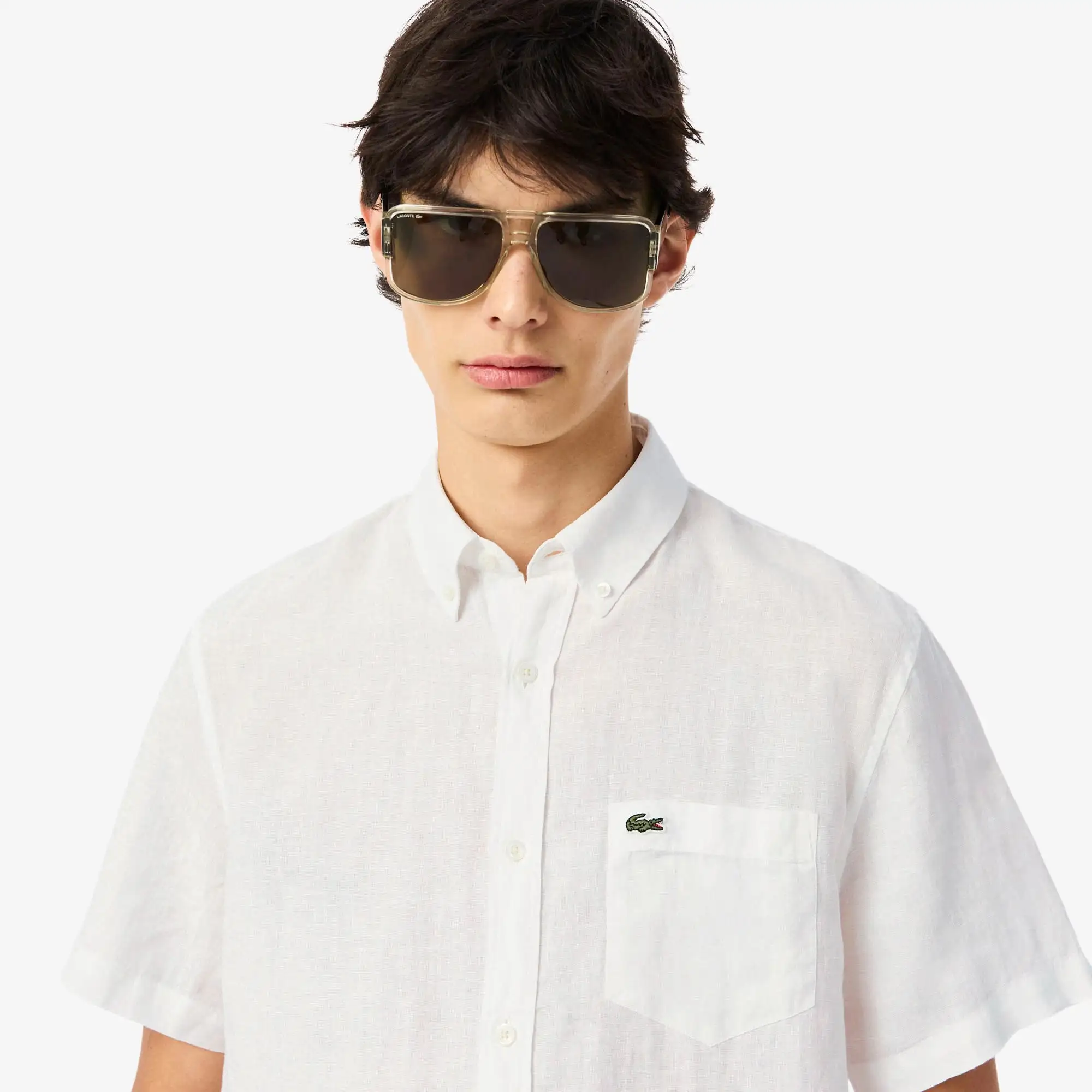 Áo sơmi tay ngắn Lacoste, form REGULAR FIT, màu trơn, có túi áo, logo cá sấu xanh, chất vải 100% linen.