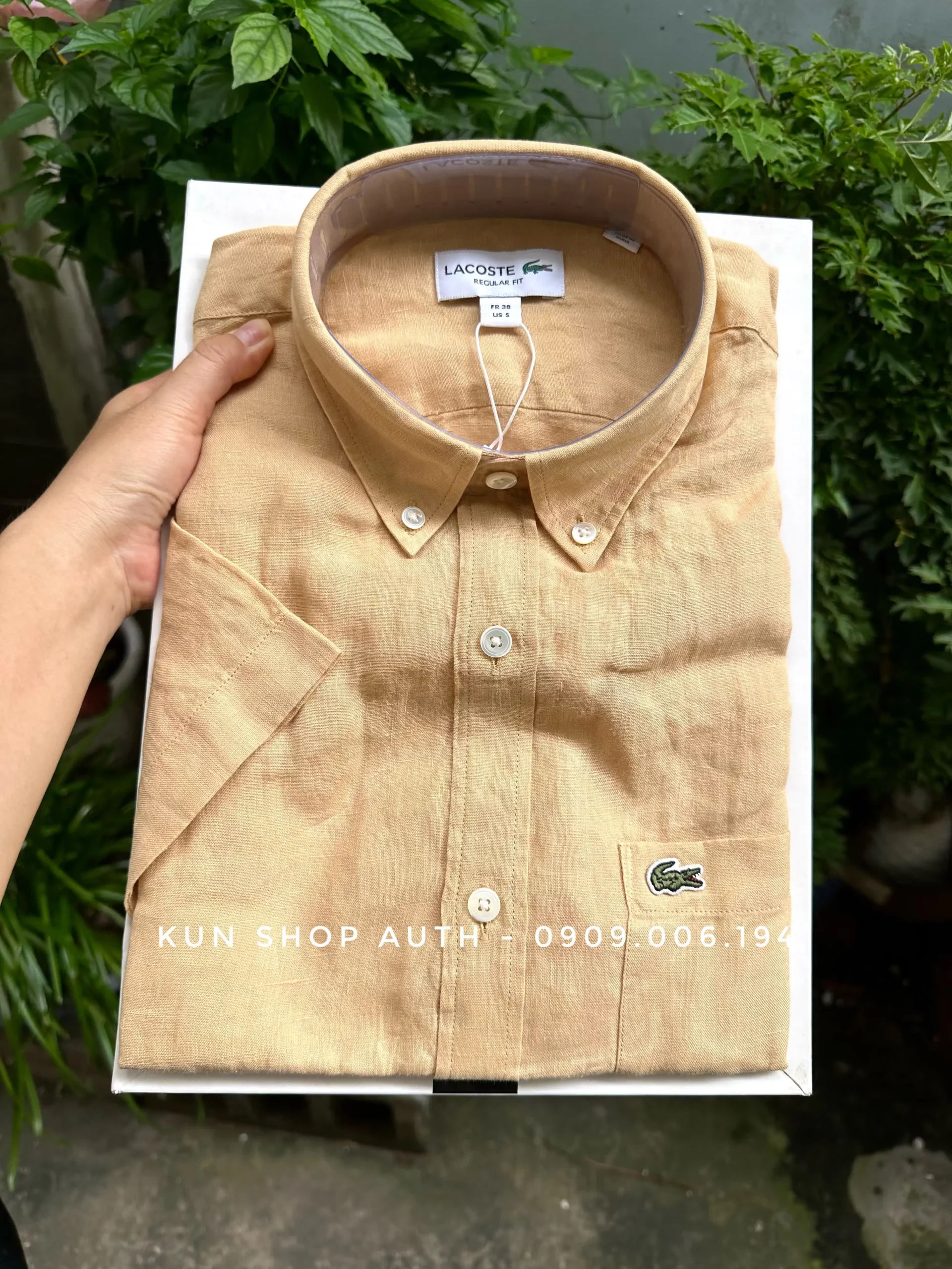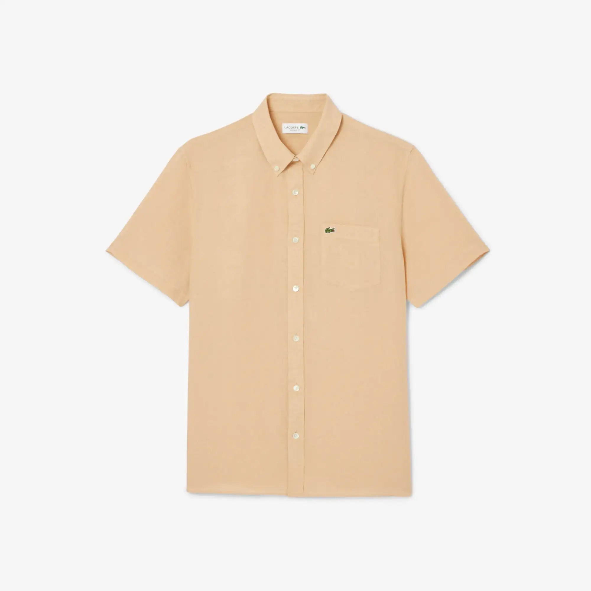 Áo sơmi tay ngắn Lacoste, form REGULAR FIT, màu trơn, có túi áo, logo cá sấu xanh, chất vải 100% linen.