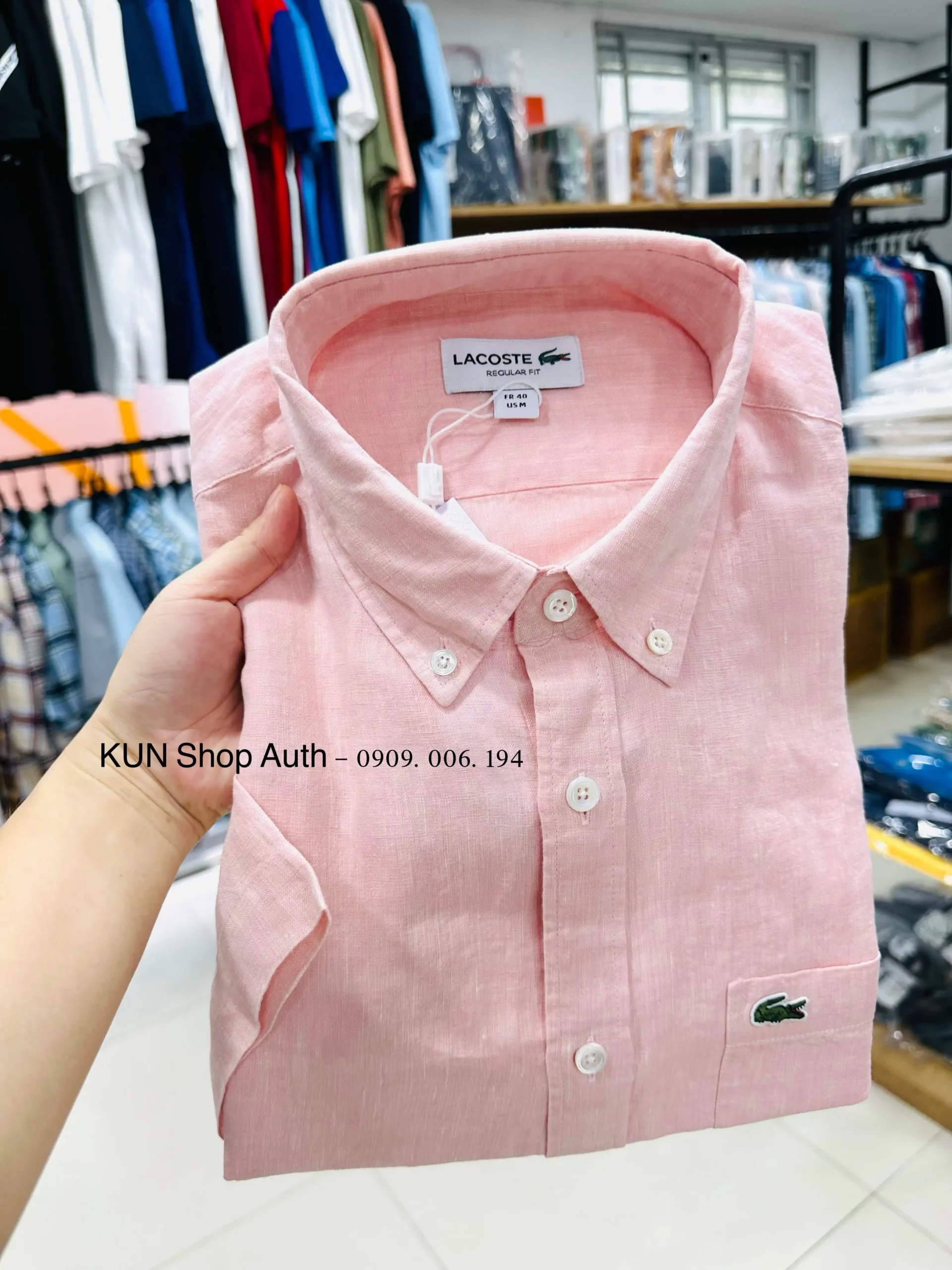 Áo sơmi tay ngắn Lacoste, form REGULAR FIT, màu trơn, có túi áo, logo cá sấu xanh, chất vải 100% linen.