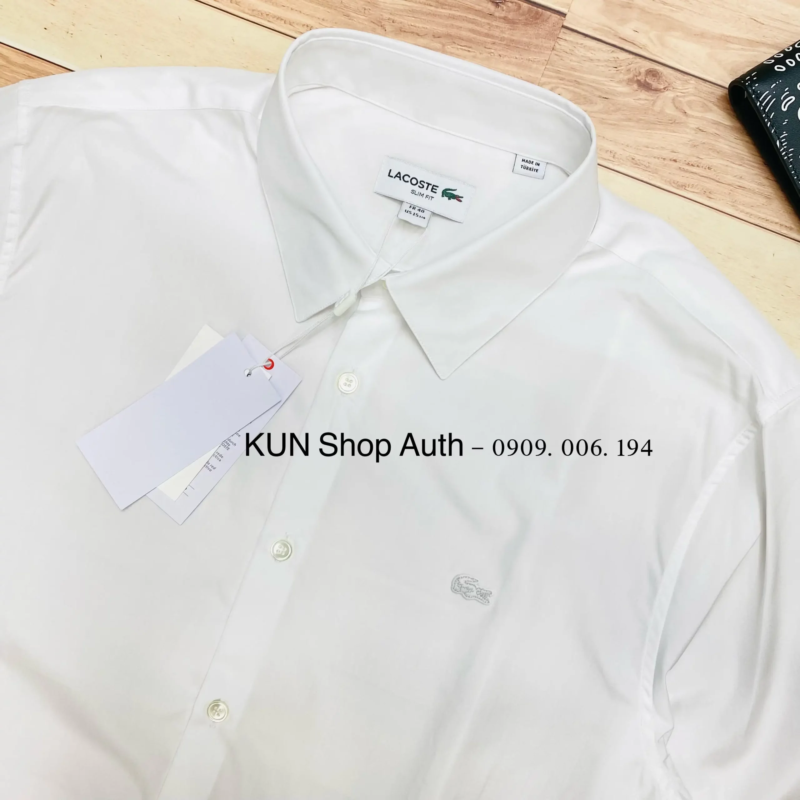 Áo sơmi tay dài Lacoste, form SLIM FIT, màu trơn, không có túi áo, logo cá sấu trắng, chất vải 100% Albini cotton của Ý.