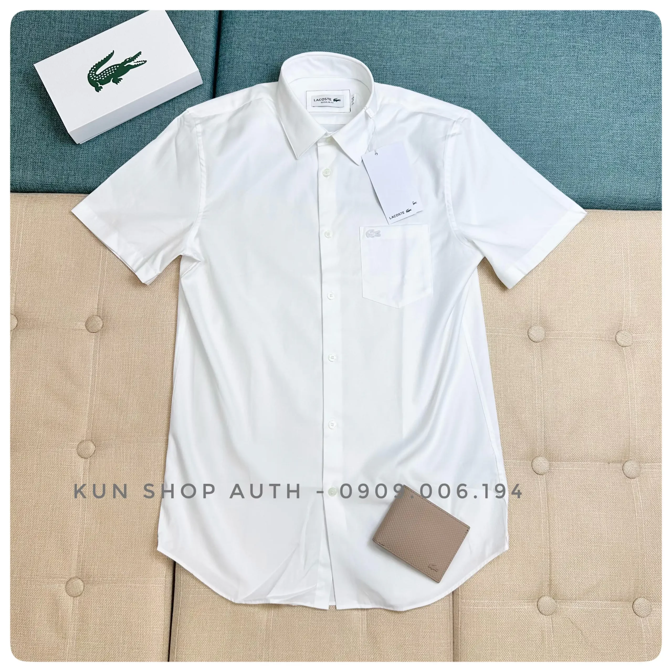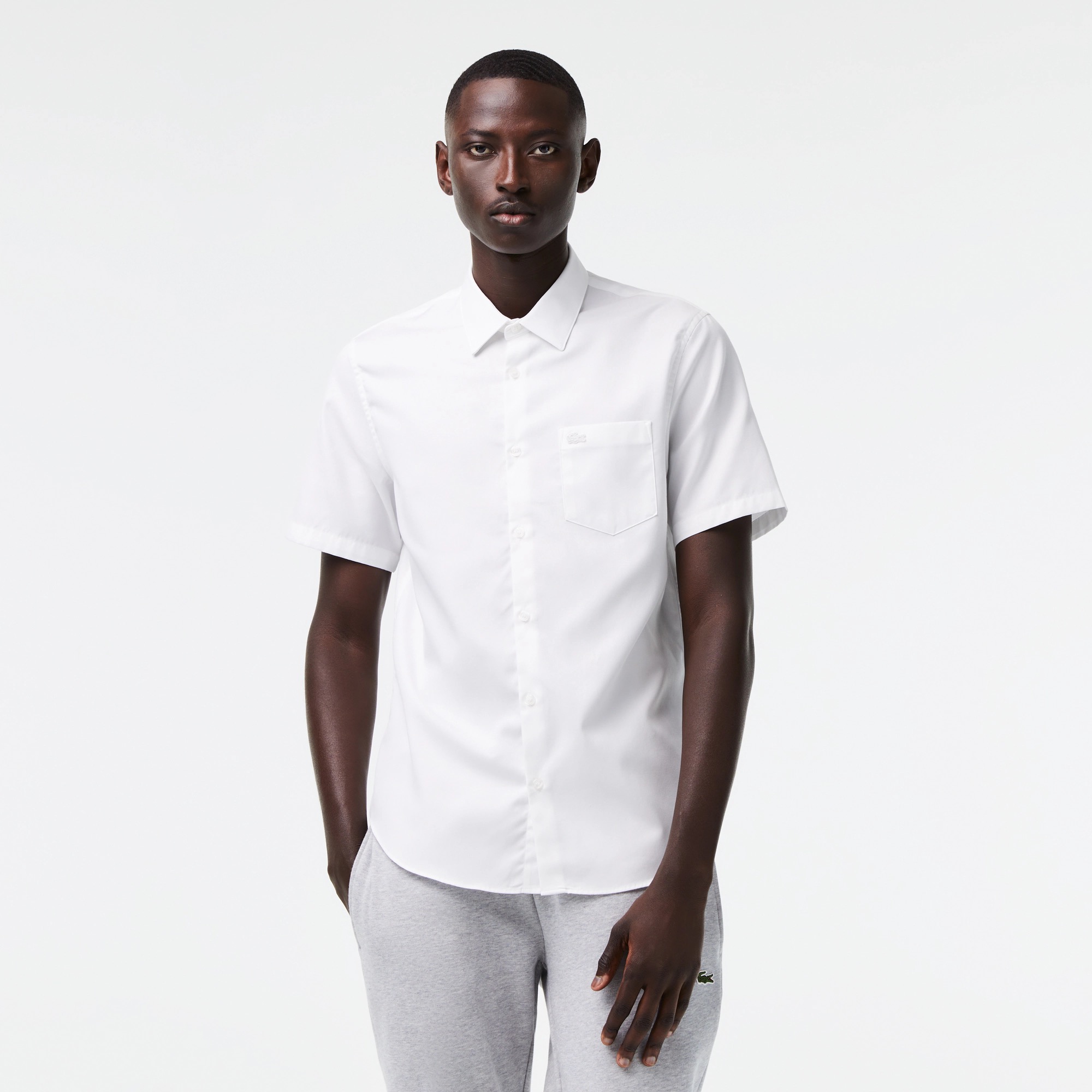 Áo sơmi tay ngắn Lacoste, form REGULAR FIT, màu trơn, có túi áo, logo cá sấu trắng, chất vải 100% soft premium cotton
