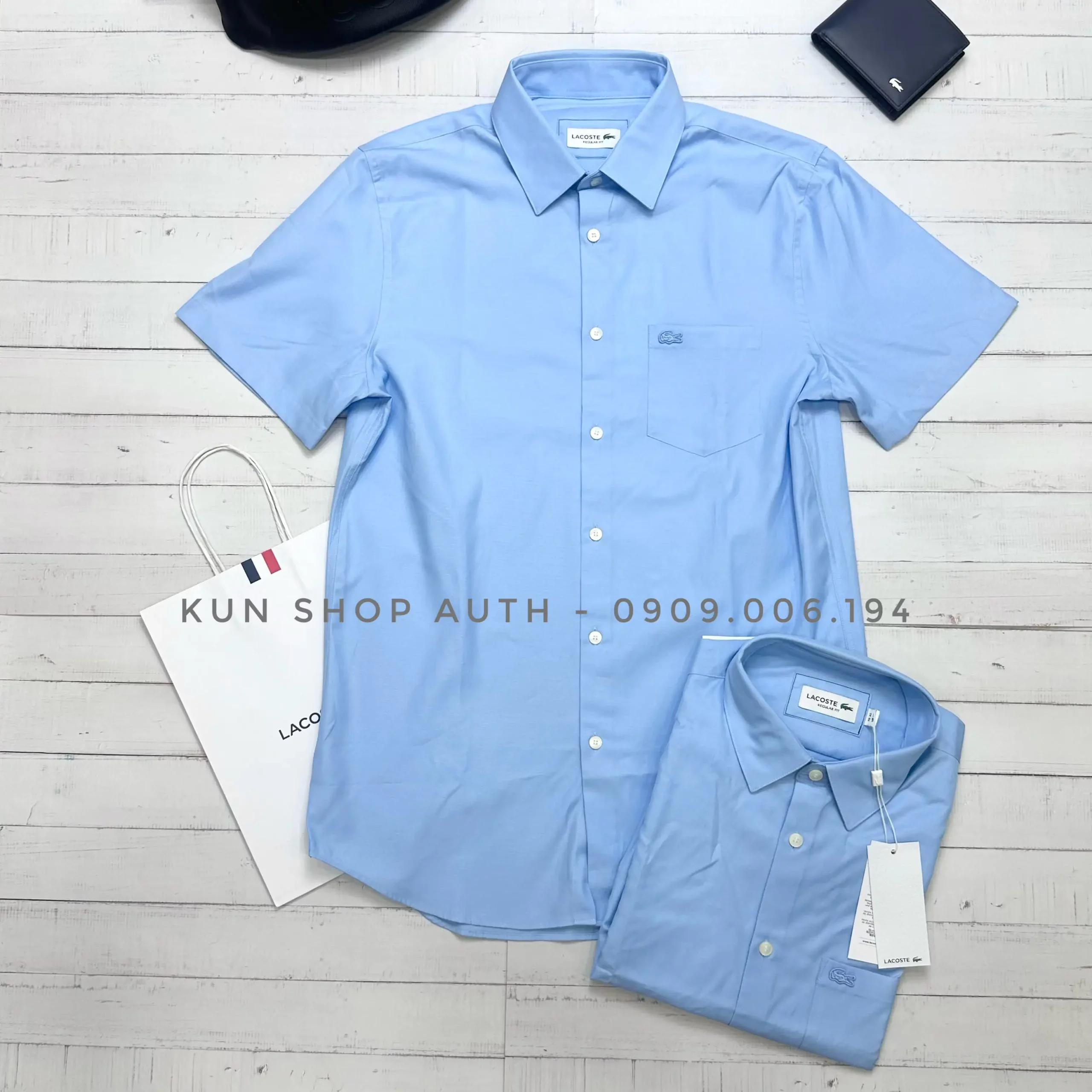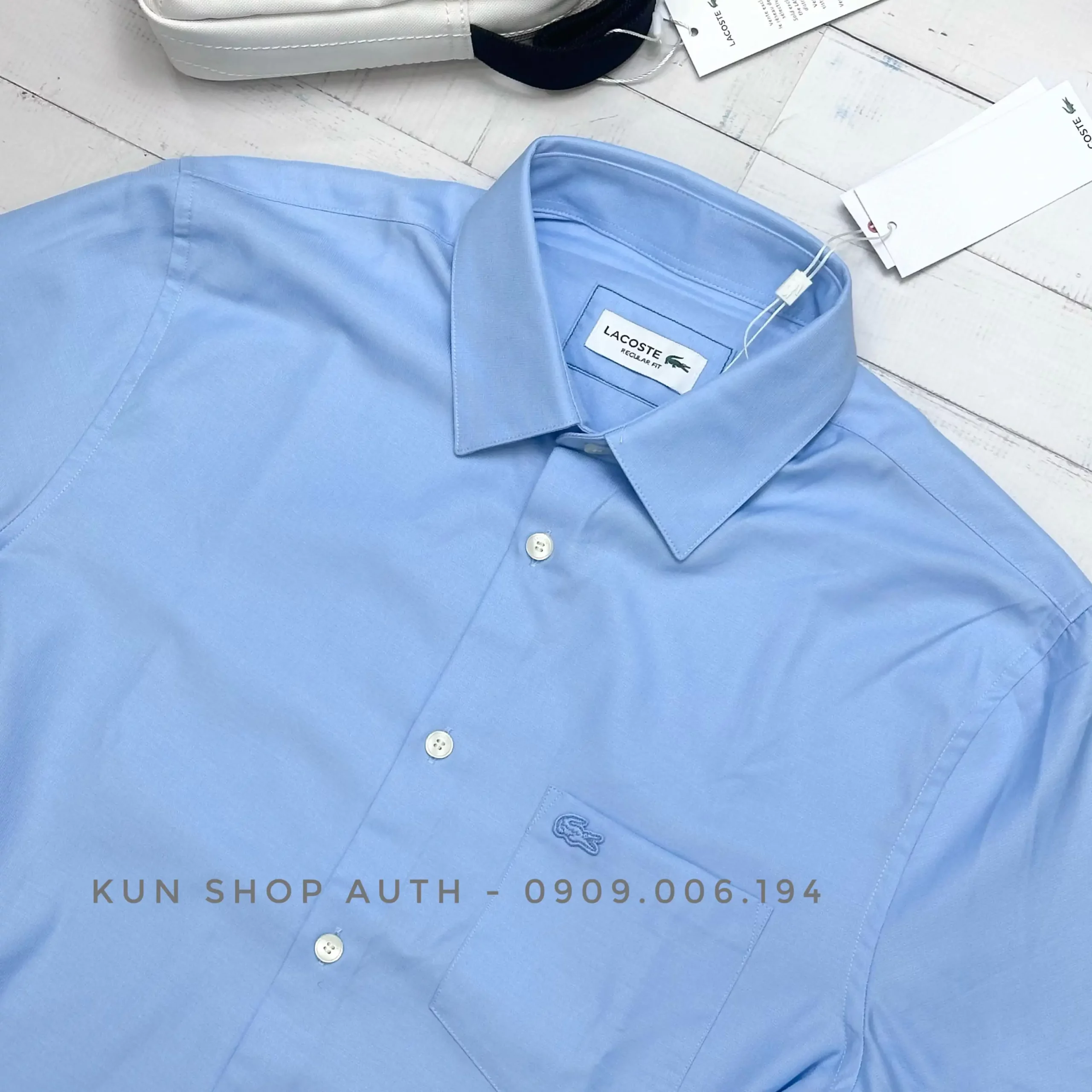 Áo sơmi tay ngắn Lacoste, form REGULAR FIT, màu trơn, có túi áo, logo cá sấu trắng, chất vải 100% soft premium cotton
