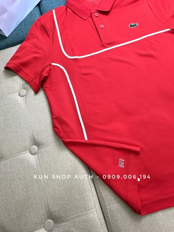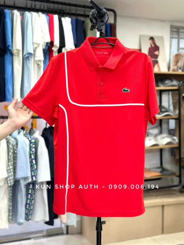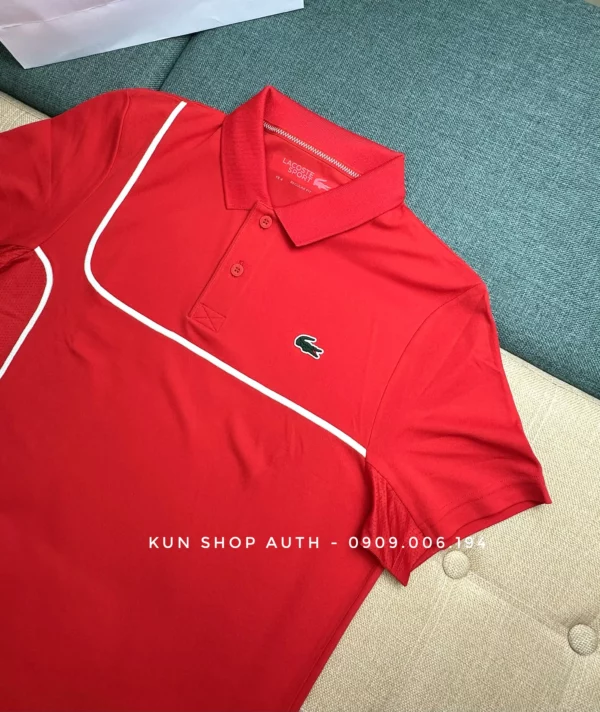 Áo Polo Lacoste dòng thể thao, form REGULAR FIT, hoạ tiết chỉ xung quanh áo, chất liệu 100% polyester.