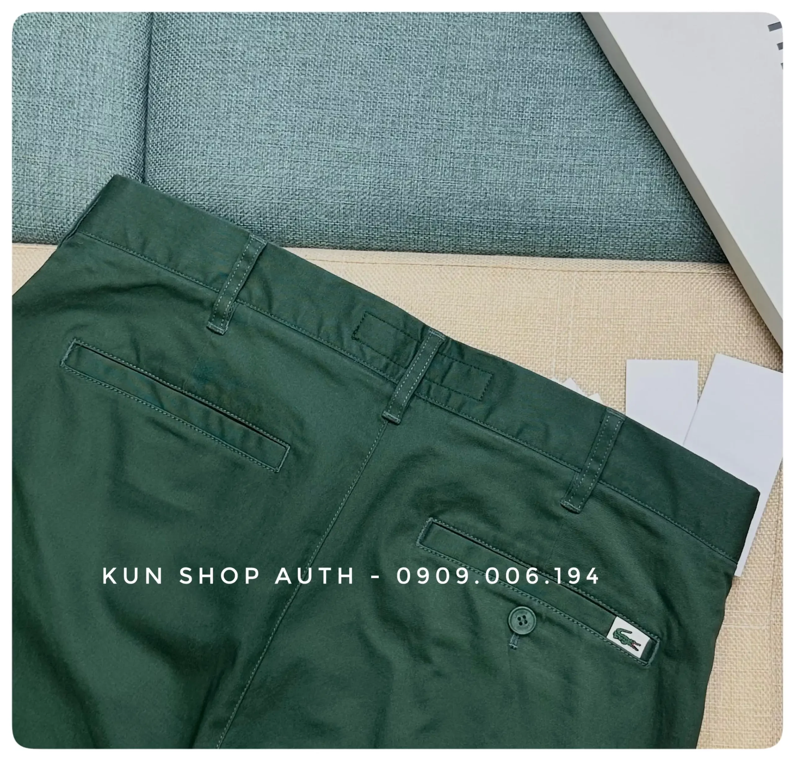Quần kaki dài Lacoste, form CUSTOM SLIM FIT, logo cá sấu ở túi quần sau, túi sau có nút, chất vải 97% cotton pha 3% Elastane