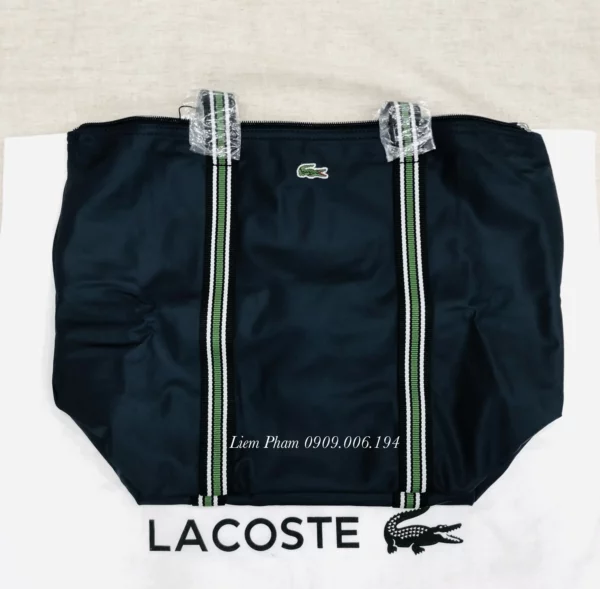 Túi Tote Lacoste form đứng, khoá kéo Jeanne Striped Handles Canvas, thiết kế basic màu trơn, logo cá sấu thêu. Chất liệu 100% Polyamide – Ultra light Nylon.