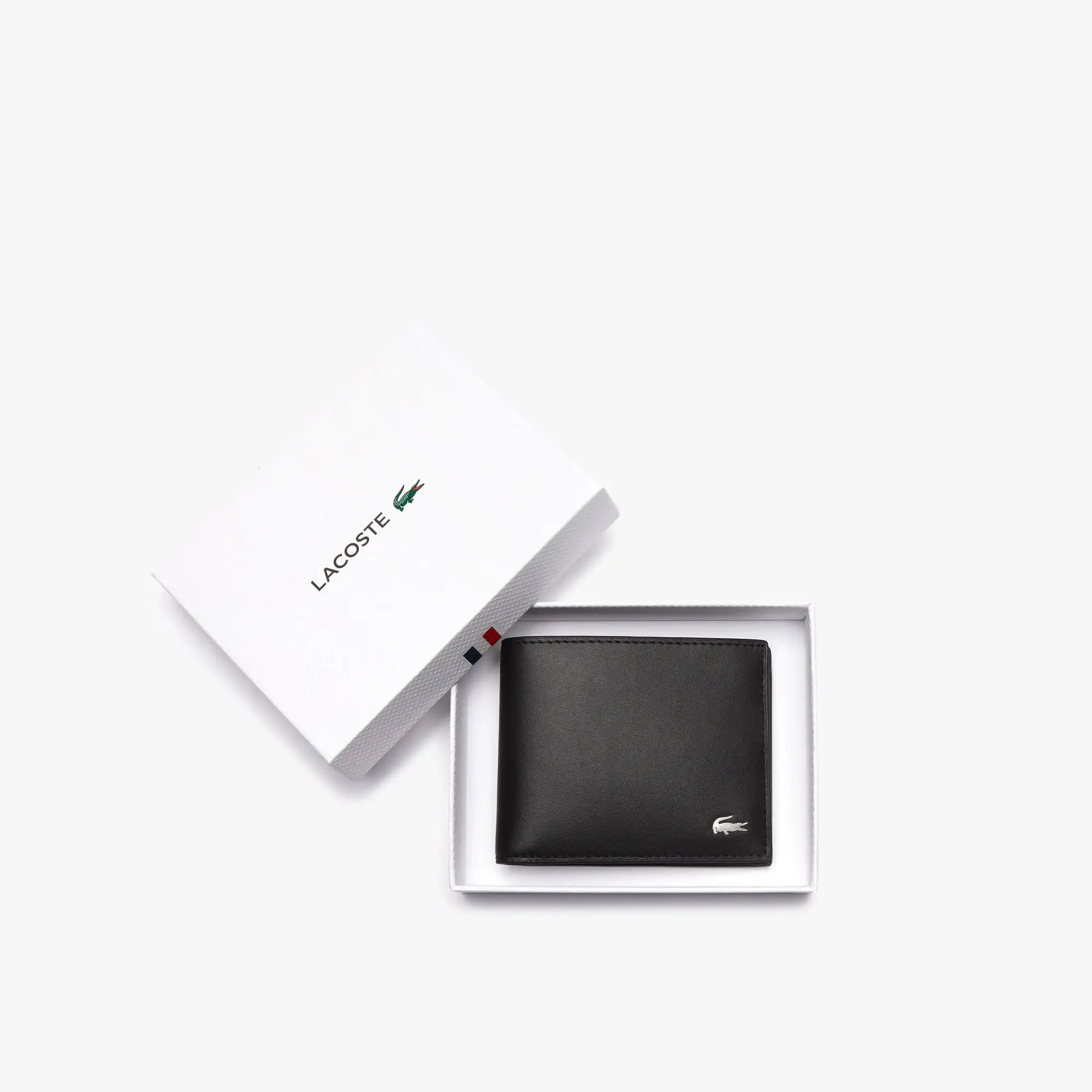 Ví nam gập đôi Lacoste Small Billfold, thiết kế màu trơn, logo cá sấu kim loại trắng, chất liệu da bò