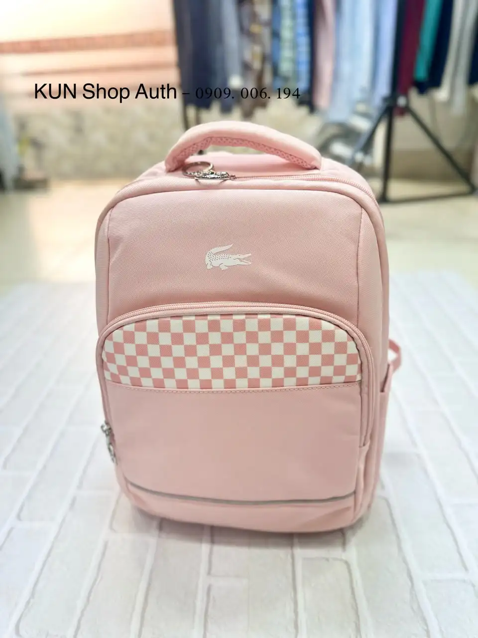 Balo Lacoste Kid, hoạ tiết caro, logo cá in, vải dù 100% polyester.