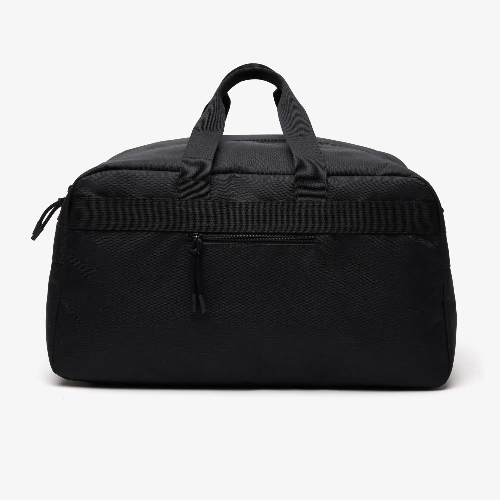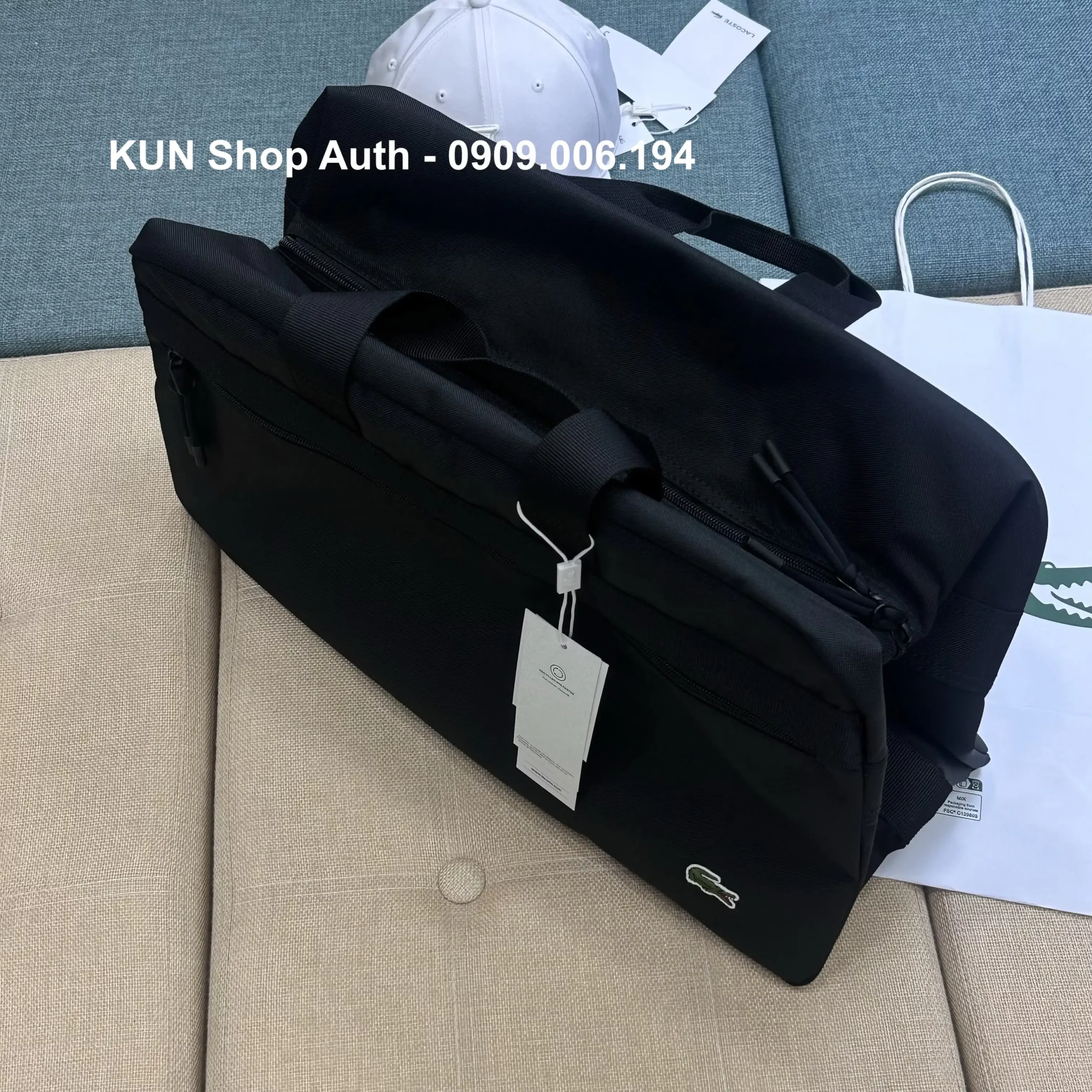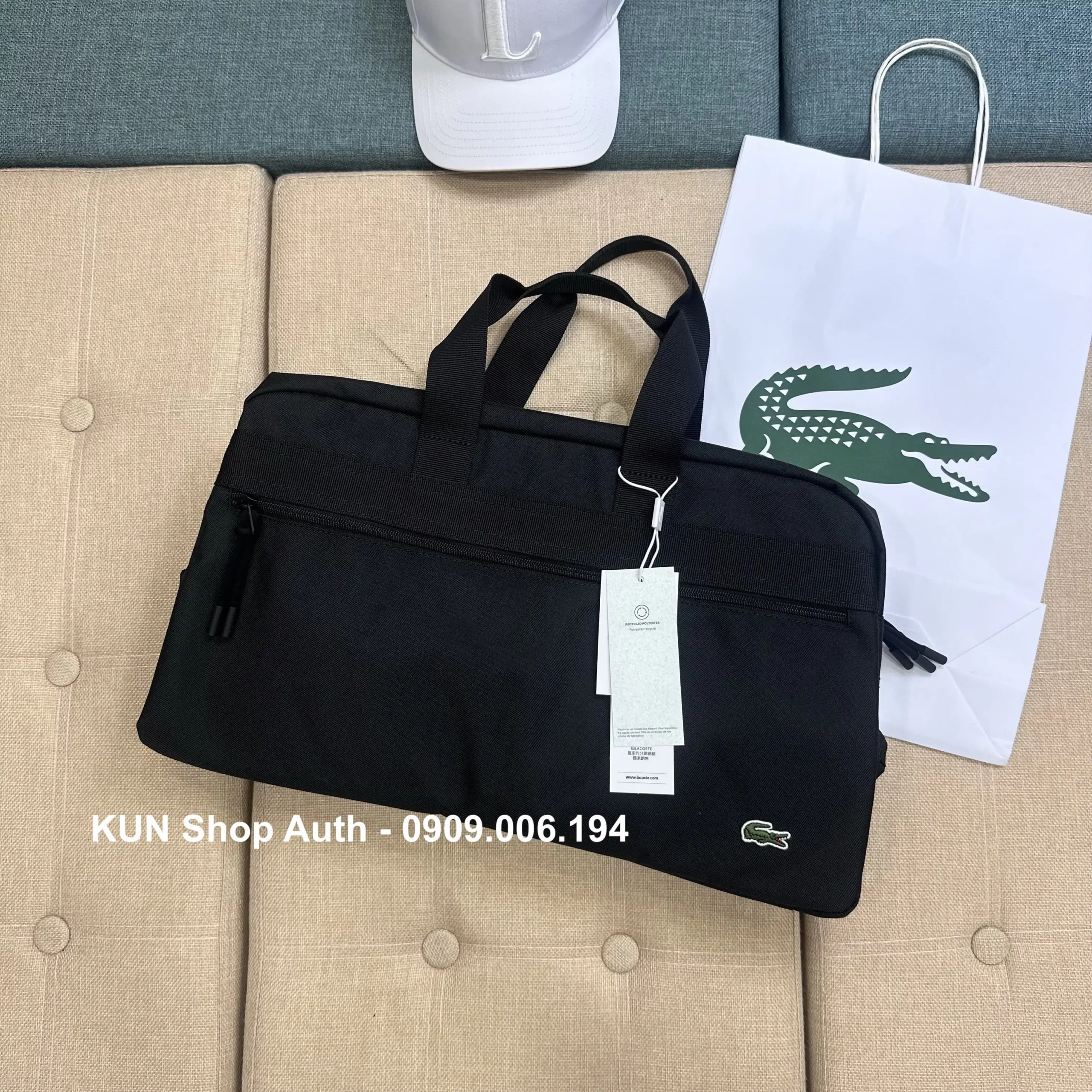 Túi du lịch basic Lacoste, thiết kế màu trơn, logo cá sấu xanh truyền thống, chất vải 100% Polyester