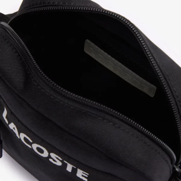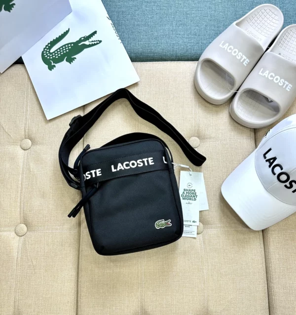 Túi đeo chéo Lacoste, dáng đứng, hoạ tiết chữ Lacoste chạy ngang túi. Chất liệu 100% Polyester