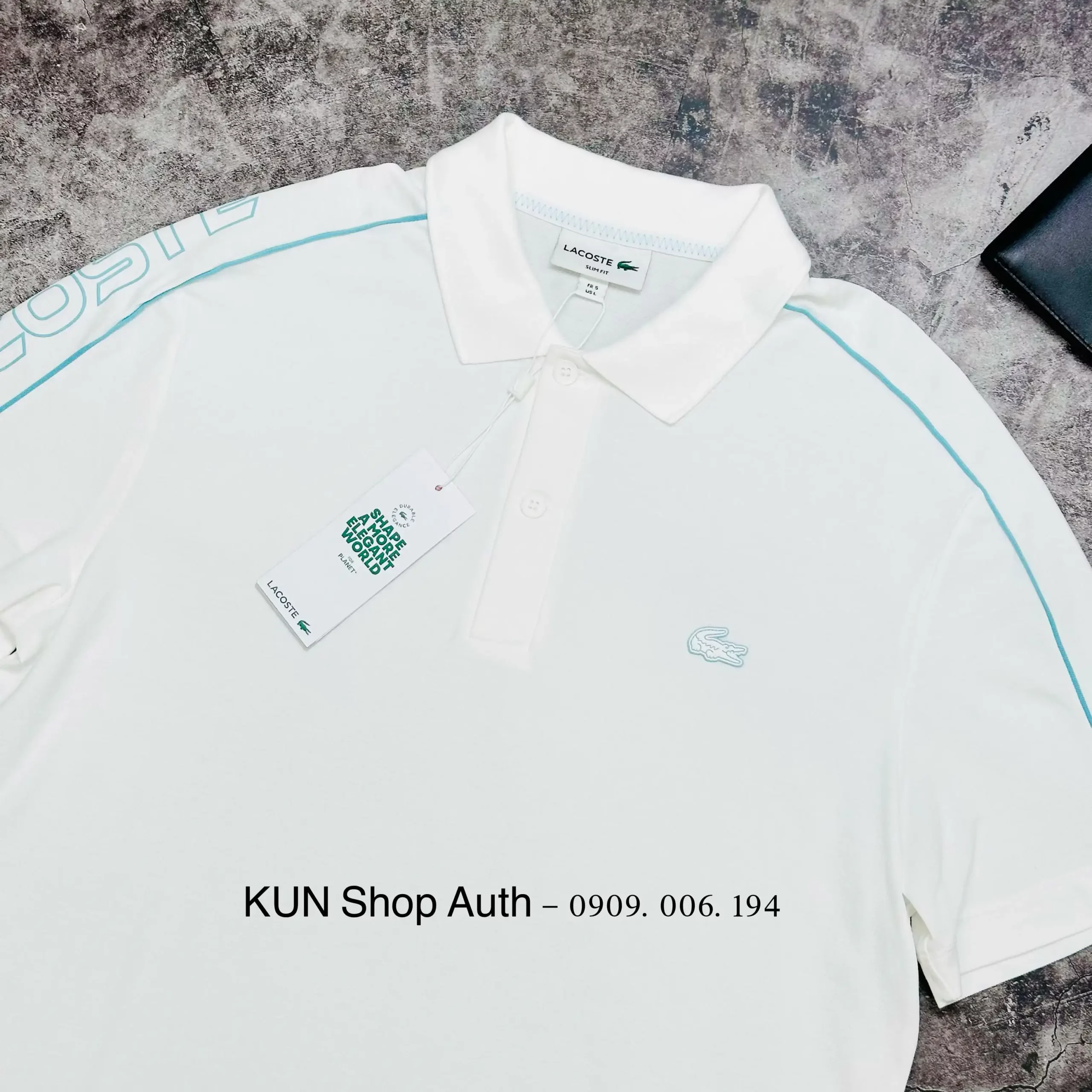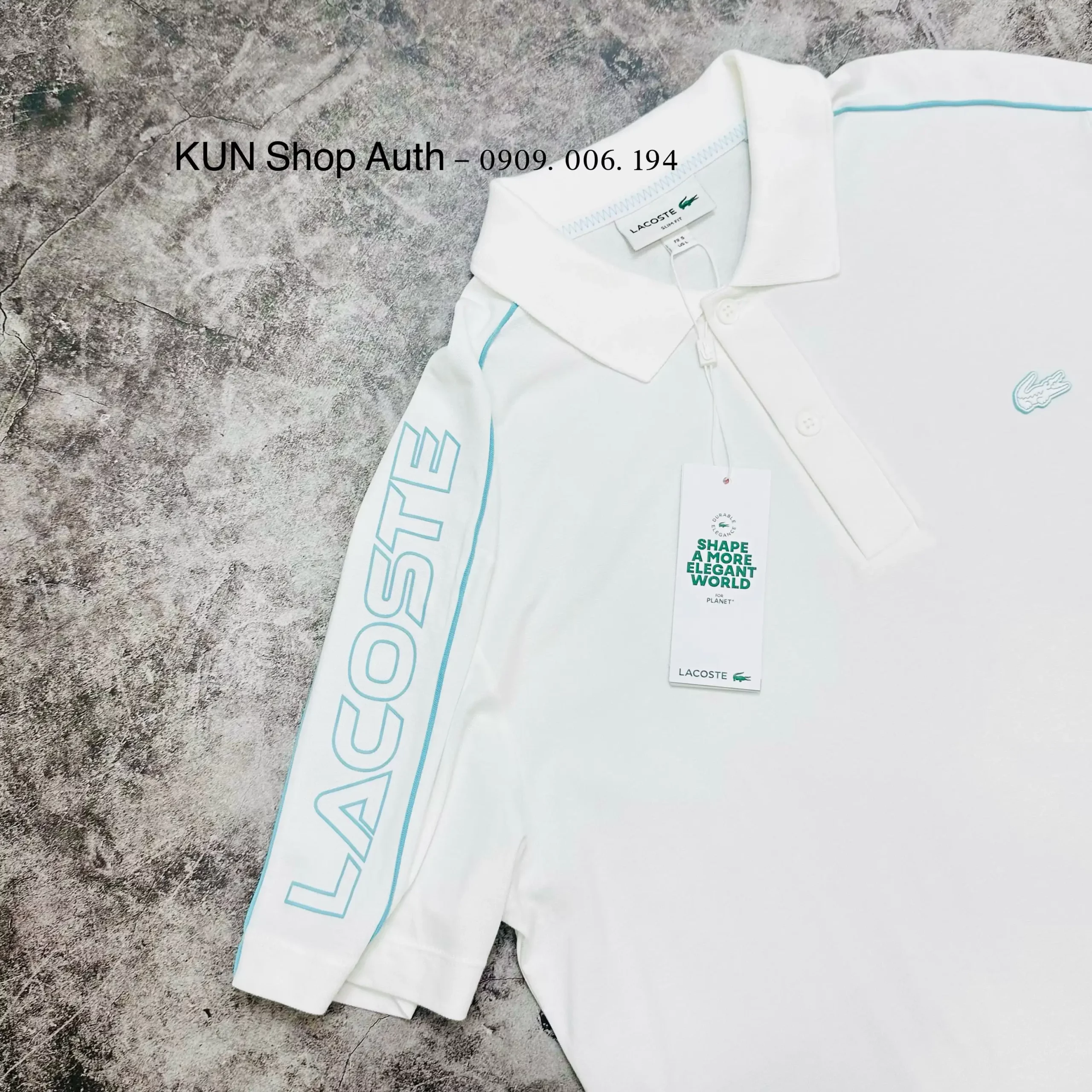 Áo Polo Lacoste, form SLIM FIT, chữ Lacoste ép nhiệt dọc trên vai áo, logo cá sấu nhựa, chất vải 63% cotton 31% pha polyester và 6% Elastane.