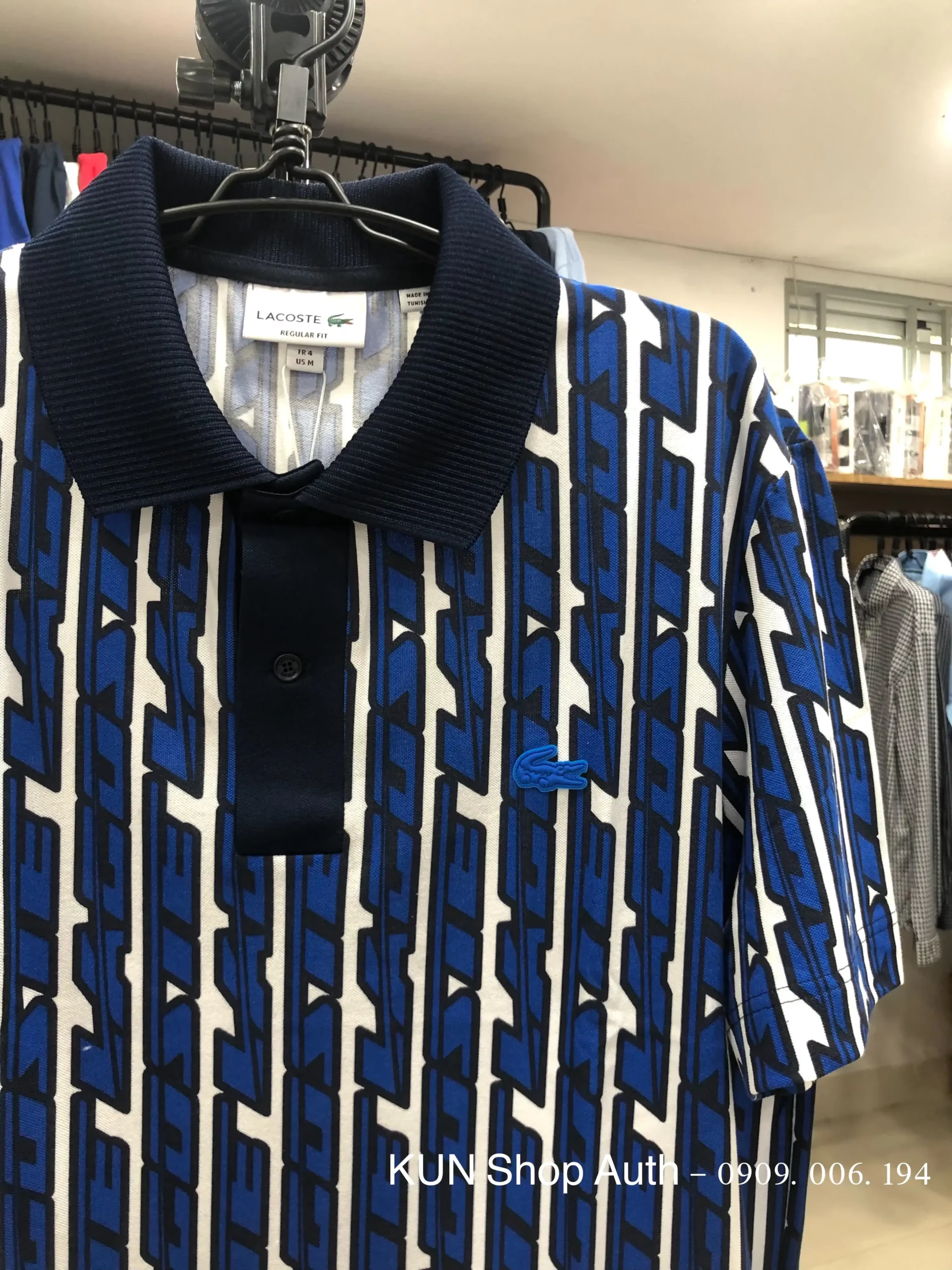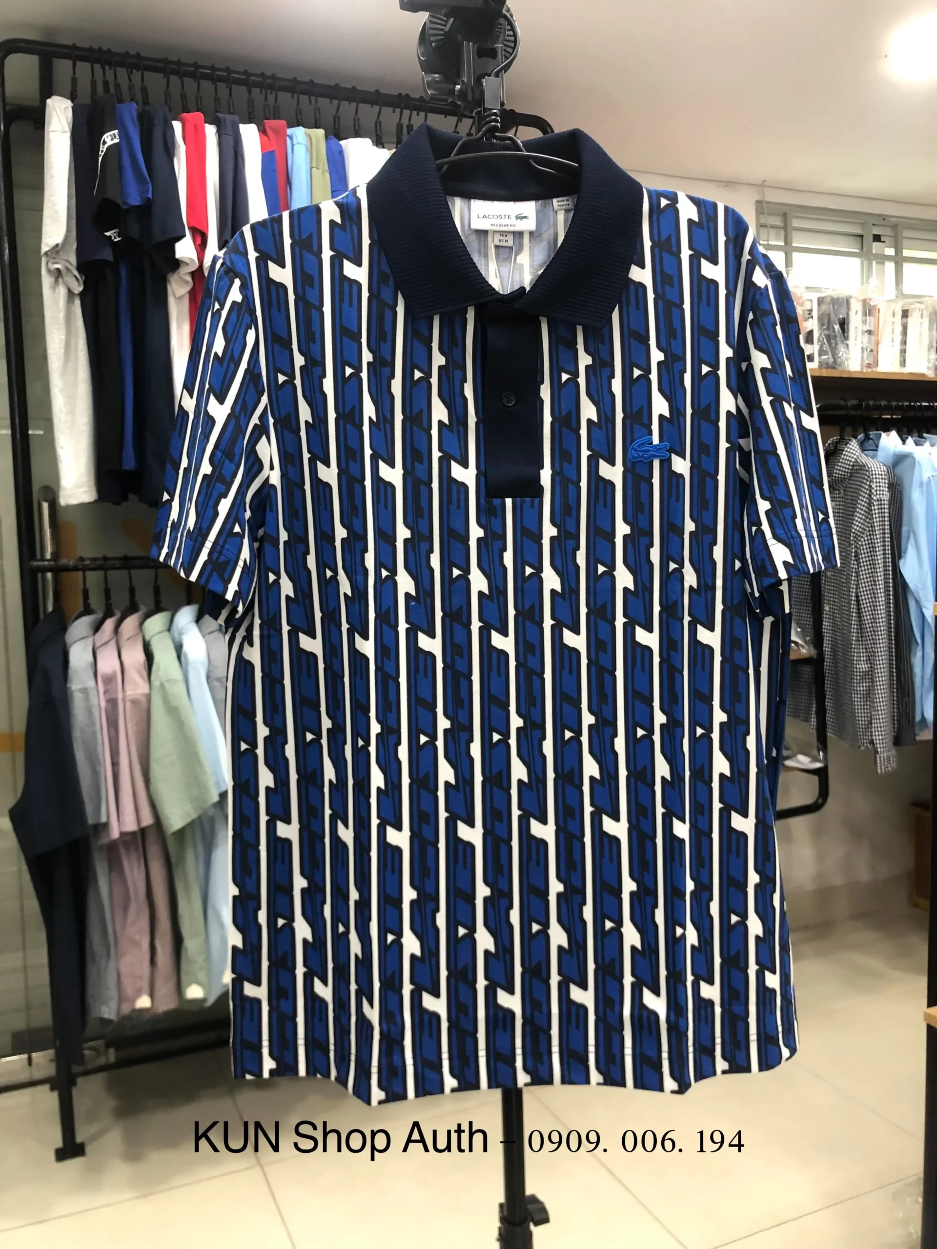 Lacoste polo REGULAR FIT hoạ tiết dòng chữ Lacoste chạy dọc khắp áo, logo cá sấu nhựa cùng màu áo, chất vải cotton 63% pha polyester 31% và 6% elastane