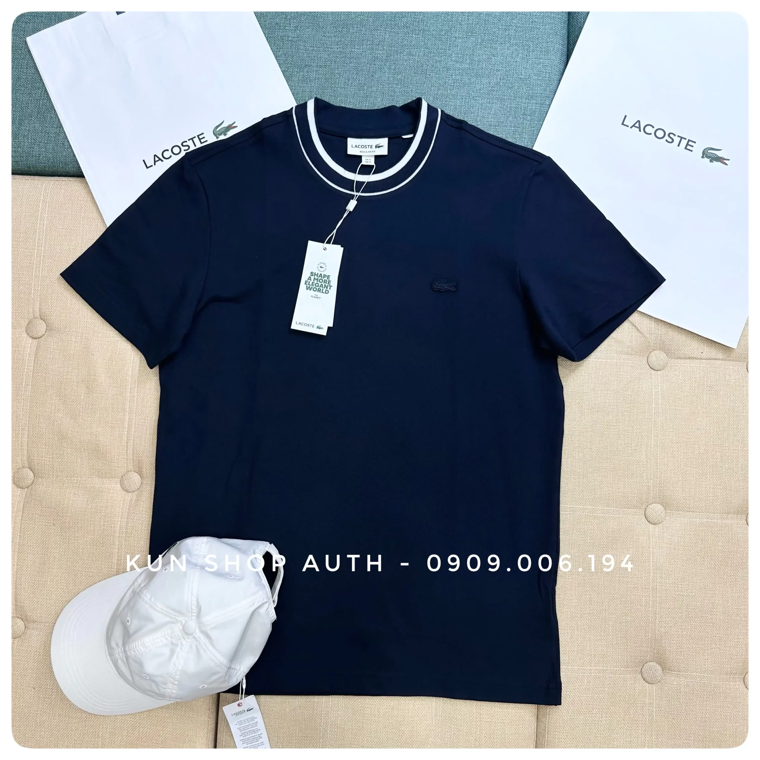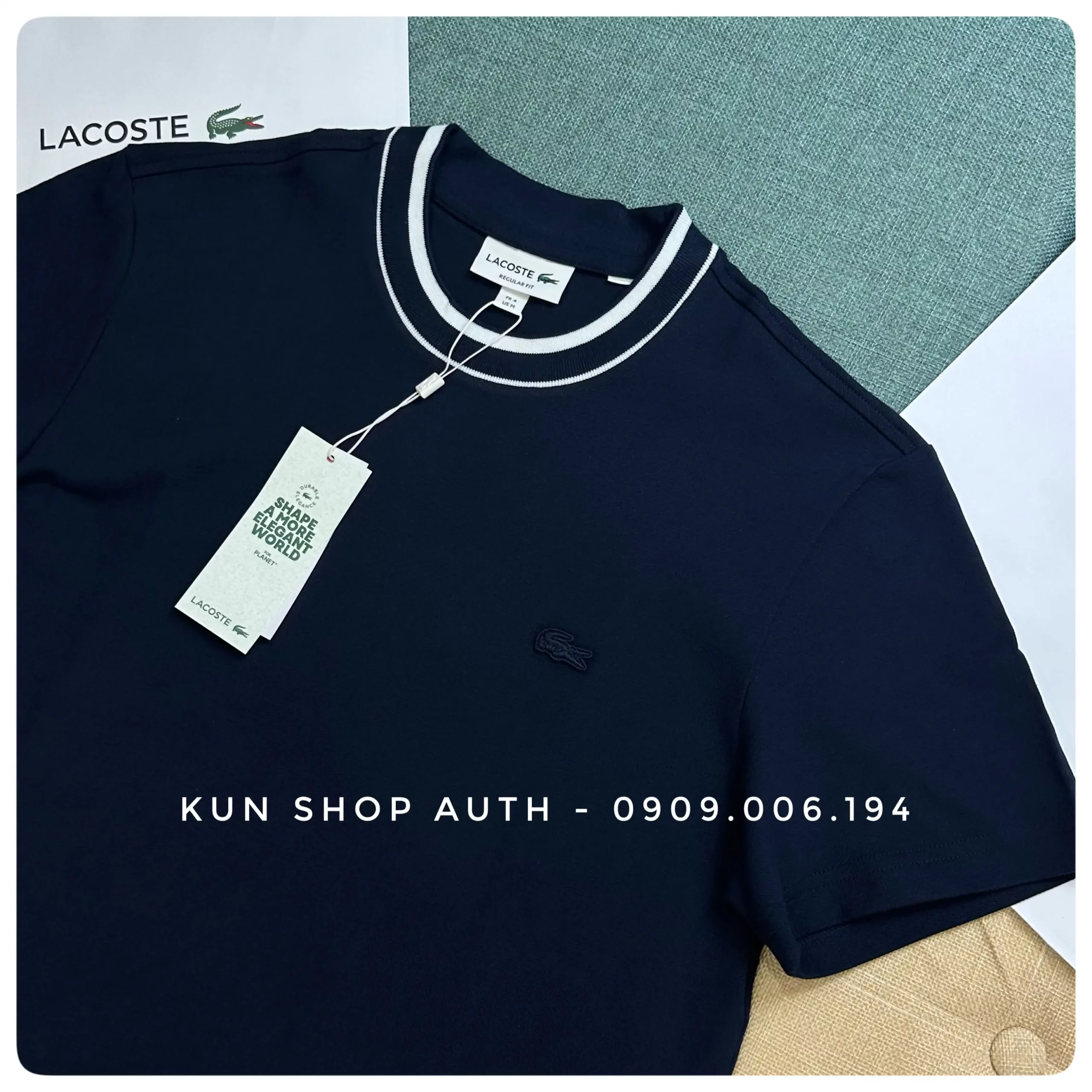 Áo thun cổ tròn Lacoste, form REGULAR FIT, thiết kế 2 đường viền trên cổ áo, logo cá sấu thêu cùng màu áo. Chất liệu 94% cotton pha 6% elastane.